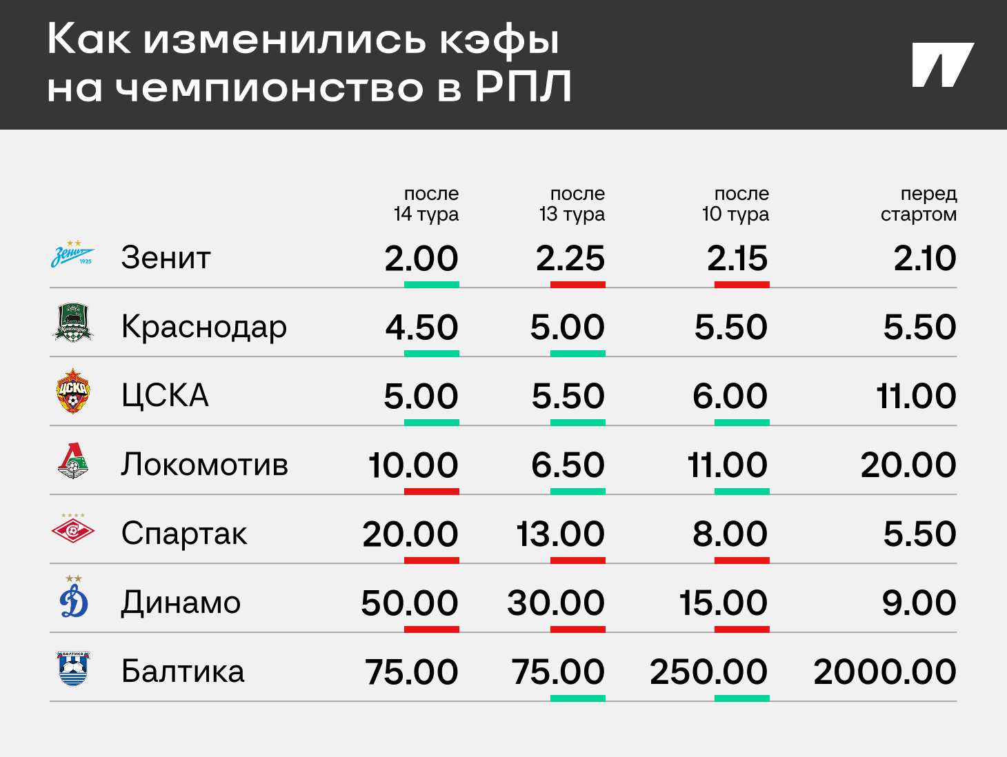 14-й тур Мир РПЛ завершился на юге: «Краснодар» обыграл «Спартак» (2:1), продлил тренд обмена победами и удержал лидерство в таблице. Но и после этого «Зенит» в линии букмекеров остается вне конкуренции.