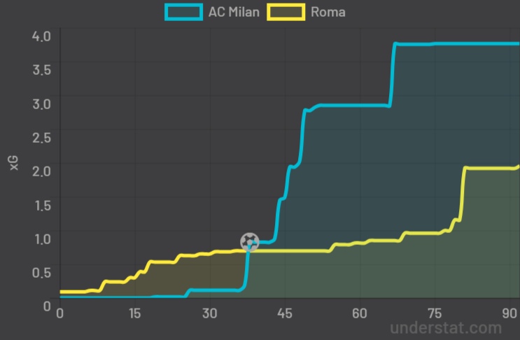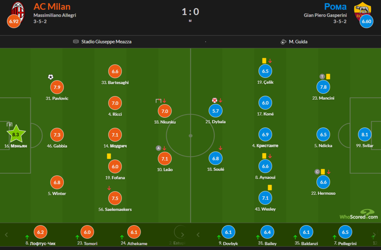 В свою очередь, «Рома» Гасперини с самого старта «задушила» хозяев персональным прессингом, препятствуя проникновению во вторую треть через короткие передачи низом, заставляя «Милан» выходить через длинные передачи на Леау (1 из 6 выигранных верховых единоборств) и Нкунку (4 из 13 выигранных единоборств, 2 из 4 верховых), либо через фланги, где игроки «волков» крайне успешно встречали Бартезаги (2 из 10 выигранных единоборств, лидер по числу утраченного владения (16)).