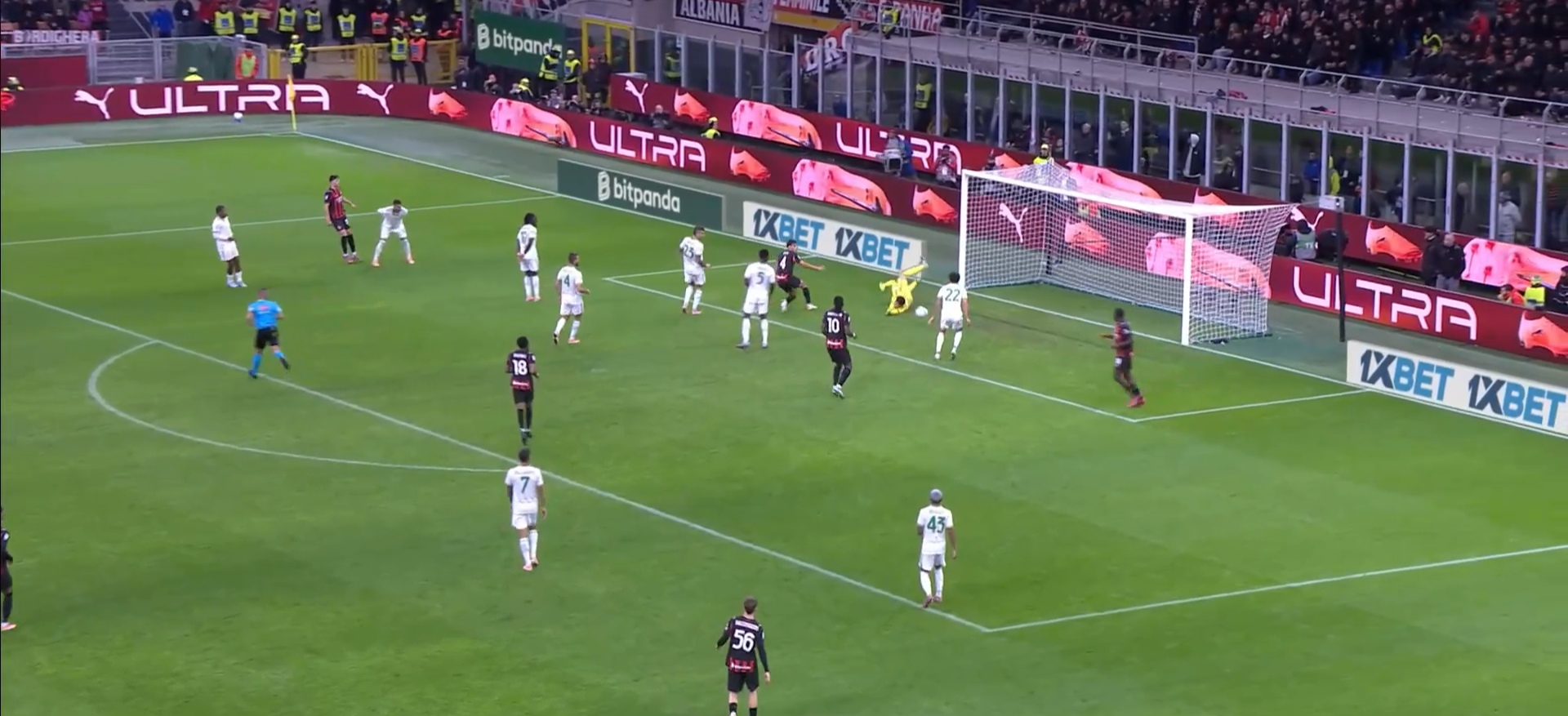 Но при этом заключительный голевой момент создали гости, воспользовавшись «умением» игроков «Милана» играть в низком блоке. Довбик сделал отличное движение из зоны одного центрального защитника в зону другого, сыграв роль стенки для своего партнера (правда, почти в больничку), из-за чего был заработан крайне опасный штрафной, с которого был заработан пенальти. Пенальти легитимный, рука была отставлена в сторону.