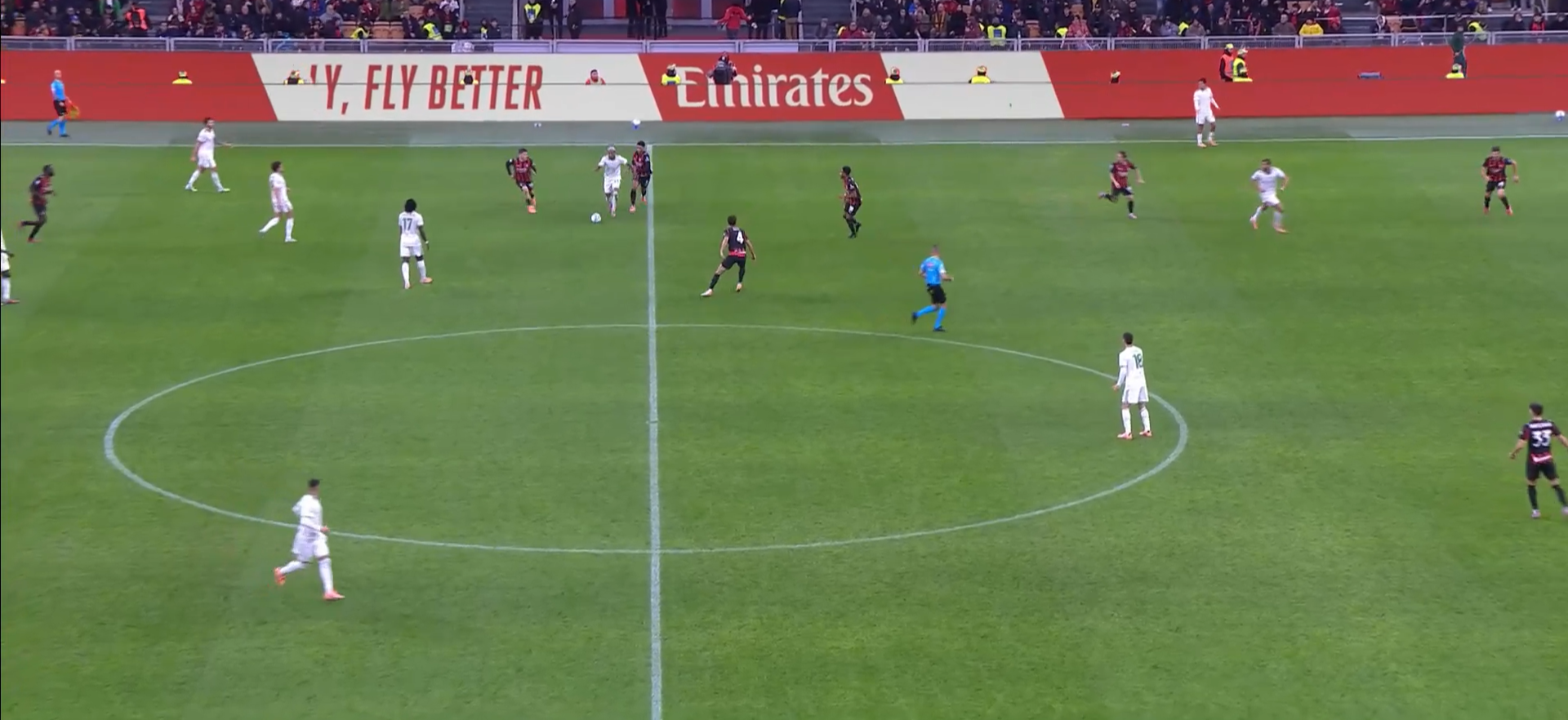 Стоит отметить изначально не совсем удачные ориентировки – Салемакерс играл по Уэсли, который уводил бельгийского игрока в глубокую позицию, в то время как Дибала выходил на мяч, а на Де Винтер за ним не доиграли, из-за чего игроки «Ромы» легко отрезали и без этого не самую активную первую линию прессинга «Милана» (и Фофану), проникая во вторую треть. Далее, ориентировки были изменены, что положительно отразилось на игре команды, но об этом позднее.