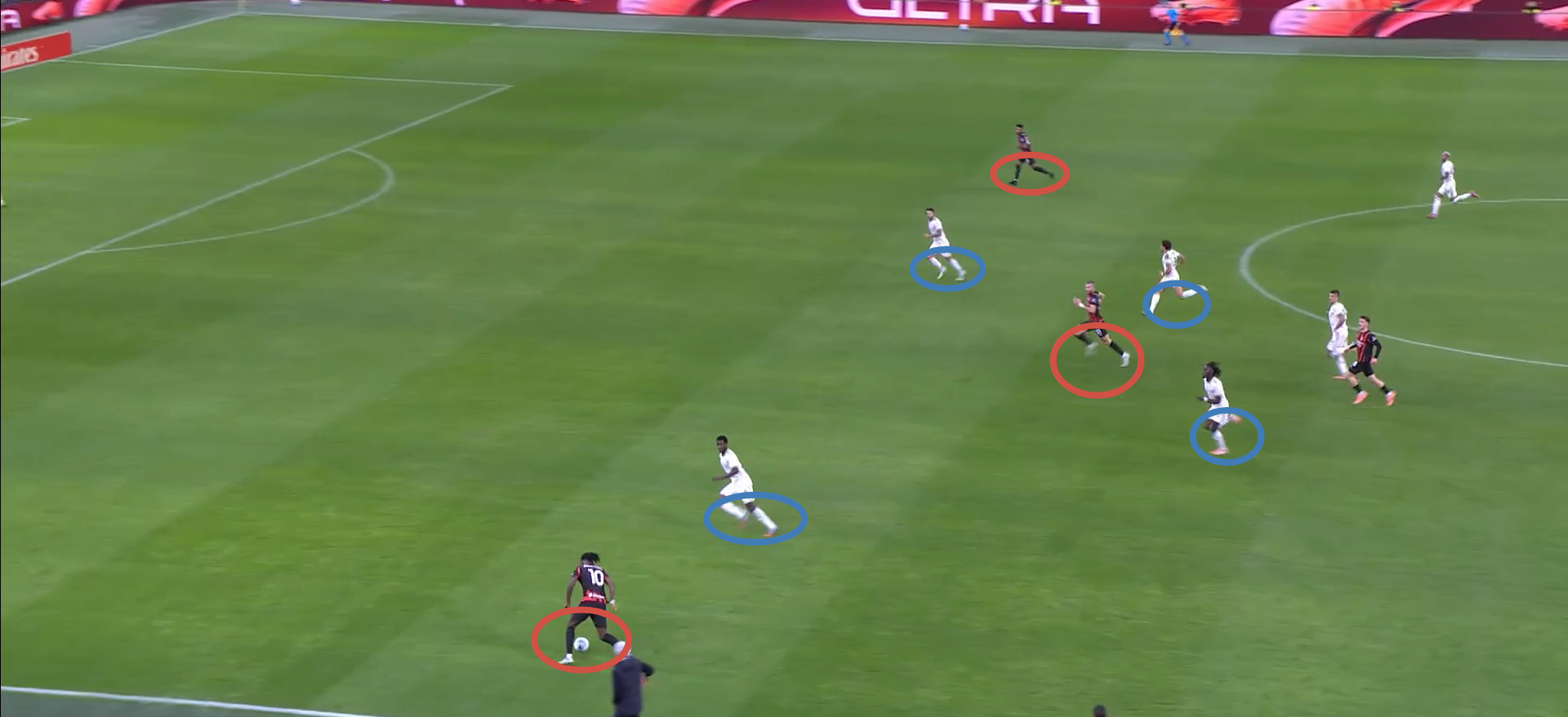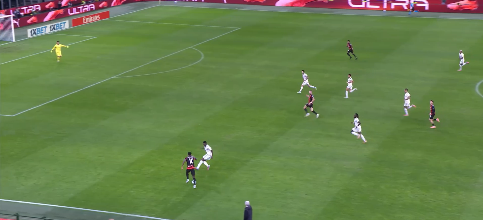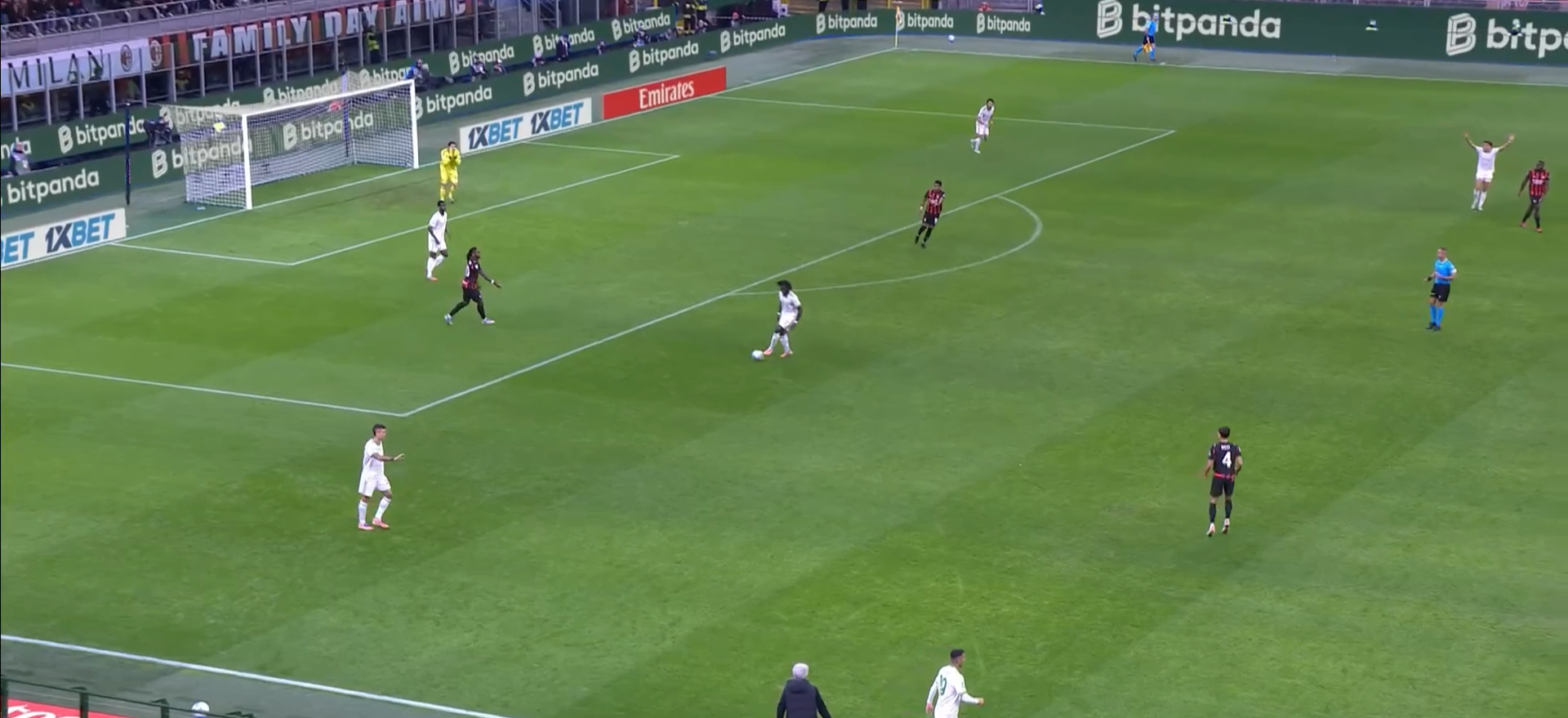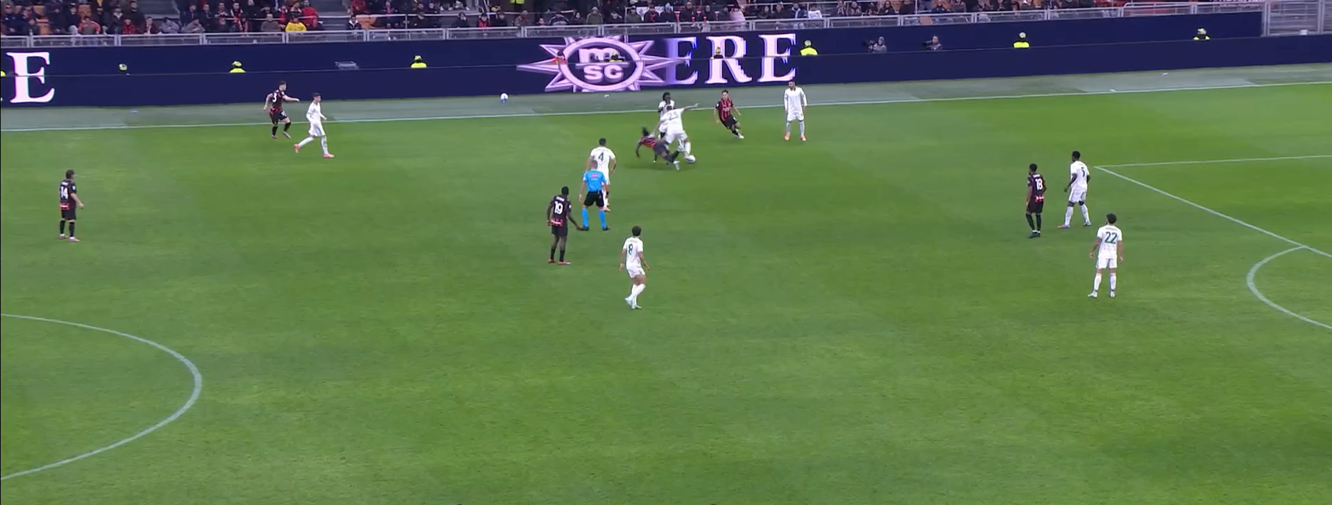 Также стоит отметить не совсем работающий средний блок команды Аллегри. Это было связано с разрывом между первой прессингующей группой и линией полузащиты. В то время как Пулишич и Хименес грамотно играют по мячу, перекрывая линии передач, Леау и Нкунку улыбаются друг другу.