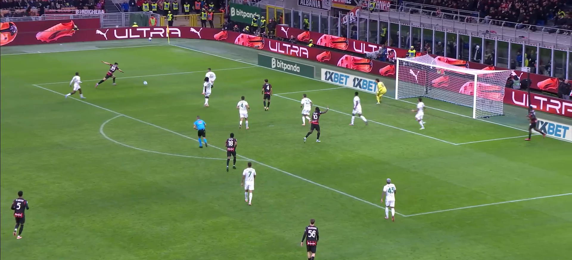 Если говорить о «Милане», то команда обладает определенной выстроенной структурой билдапа (более подробно разобрана в предыдущем разборе: https://www.sports.ru/football/blogs/3355512.html – общие механизмы команда пытается сохранить), но в связи с травмами она понесла серьезный урон, и «россонери» пытаются возродить уже сформировавшиеся механизмы, на что уходит время. Все же таким инструментарием в поиске зон и нахождении мяча, как у Кристиана Пулишича, никто в атакующей линии не обладает. Также нарушилась химия на левом фланге, где Рабьо отлично дополнял своих партнеров: в начальной стадии открываясь под передачи Луки Модрича, нередко совершая вертикальные рывки, что контрастирует с манерой игры Самуэля Риччи. Молодой итальянец пытается выполнять данные функции, но чаще остается статичным в ожидании мяча. Помимо этого, Адриан достаточно уверенно играет под давлением, что еще в полной мере нельзя сказать о Самуэле, способном потерять мяч прямо у границ своей штрафной. Достаточно значимую роль выполнял и Хименес, способный принять мяч спиной к воротам и обыграться с партнером (не всегда удачно, но все познается в сравнении).