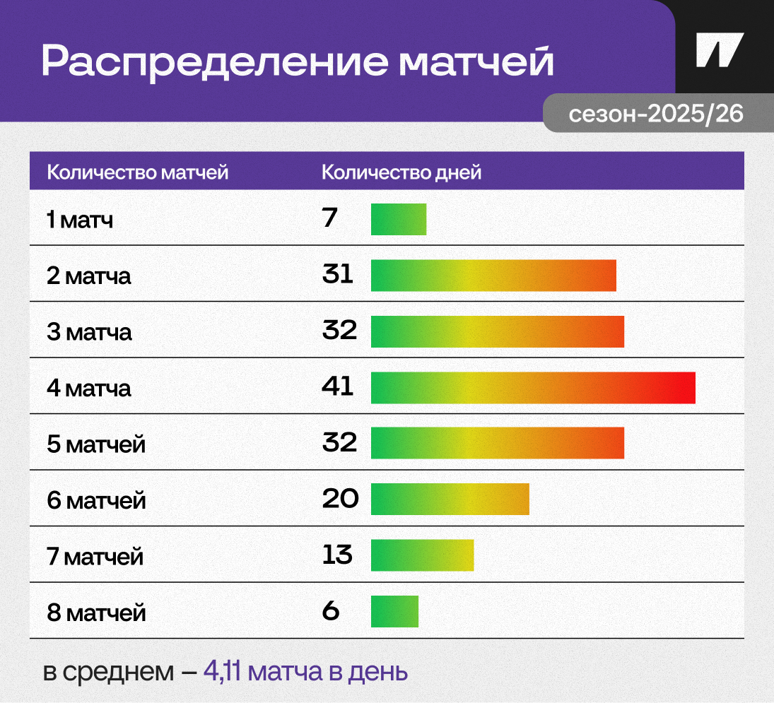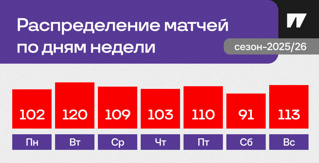 Однако здесь же скрыт и неочевидный минус. Суббота – самый свободный и расслабленный день недели – с значительным отставанием идет на последнем месте по количеству матчей. По остальным дням распределение гораздо более гладкое. В среднем на один игровой день приходится 4,11 матча; два сезона назад этот показатель был выше – 4,75.