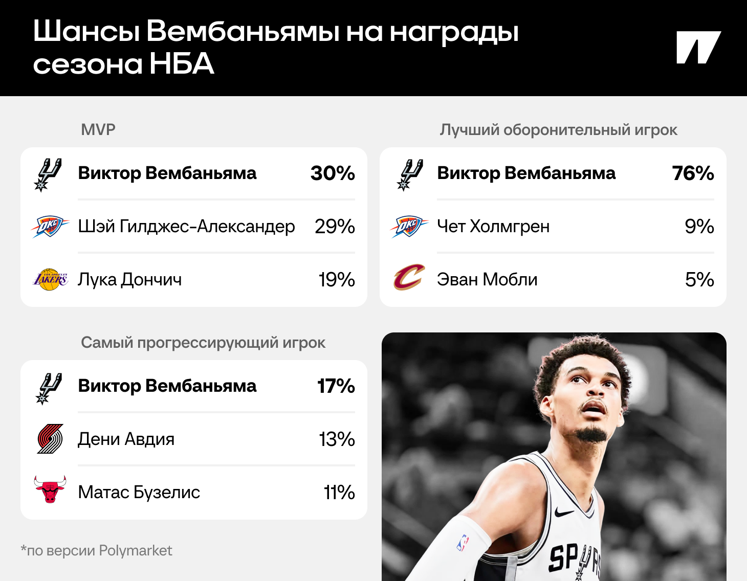 Мягко говоря, скромно для игрока, претендующего на что-то серьезное. Однако средние показатели француза в этой регулярке все-таки впечатляют: 30,2 очка, 14,6 подбора, 3,4 передачи и 4,8 блок-шота. Эффект безумный: Вембаньяма внезапно стал фаворитом сразу на три индивидуальные награды на бирже прогнозов Polymarket.