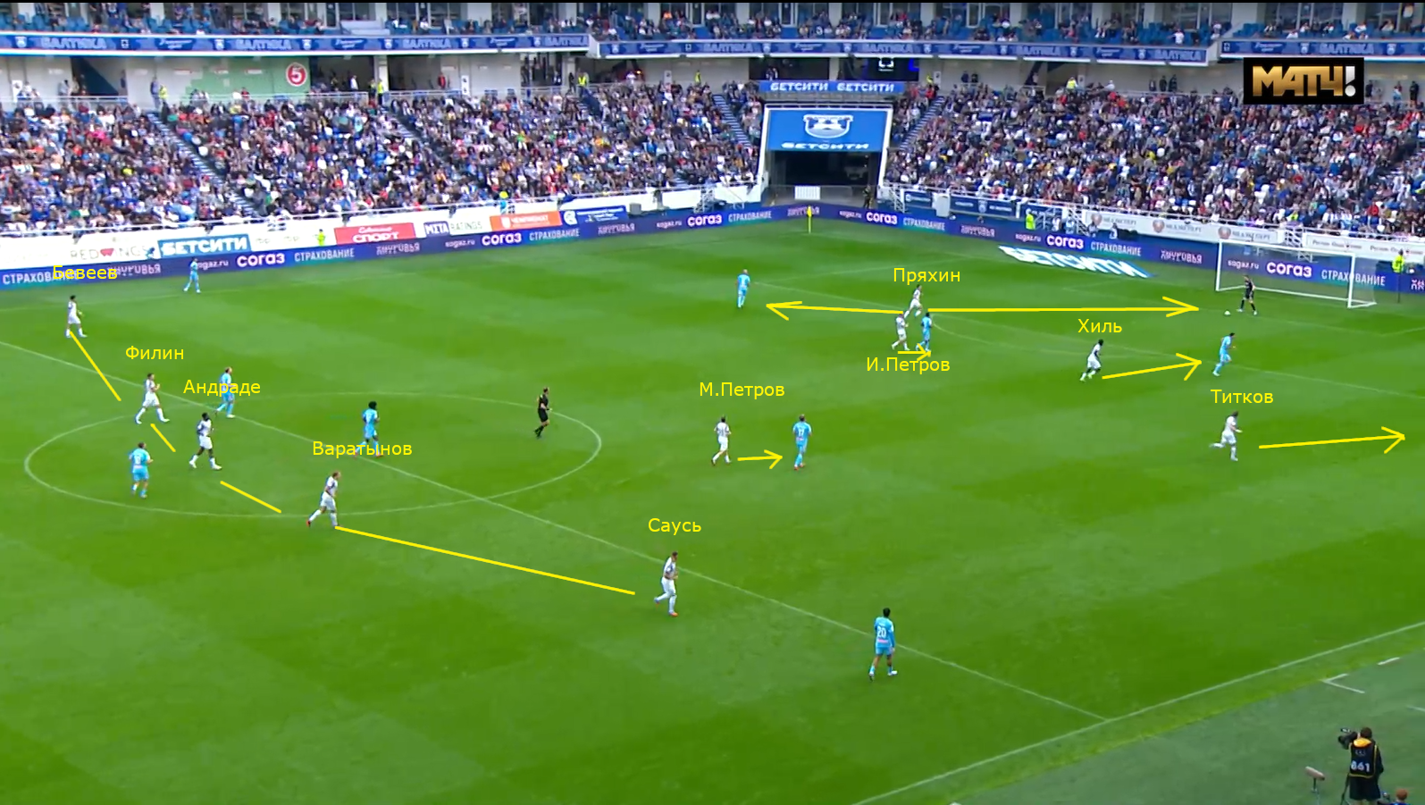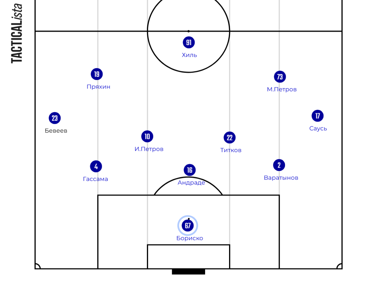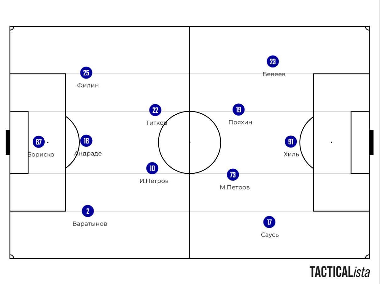 5-4-1. Ну, я бы отметил ещё активность Максима Петрова, который по роли напоминает «опорника-собаку» — агрессивно идёт на игрока.