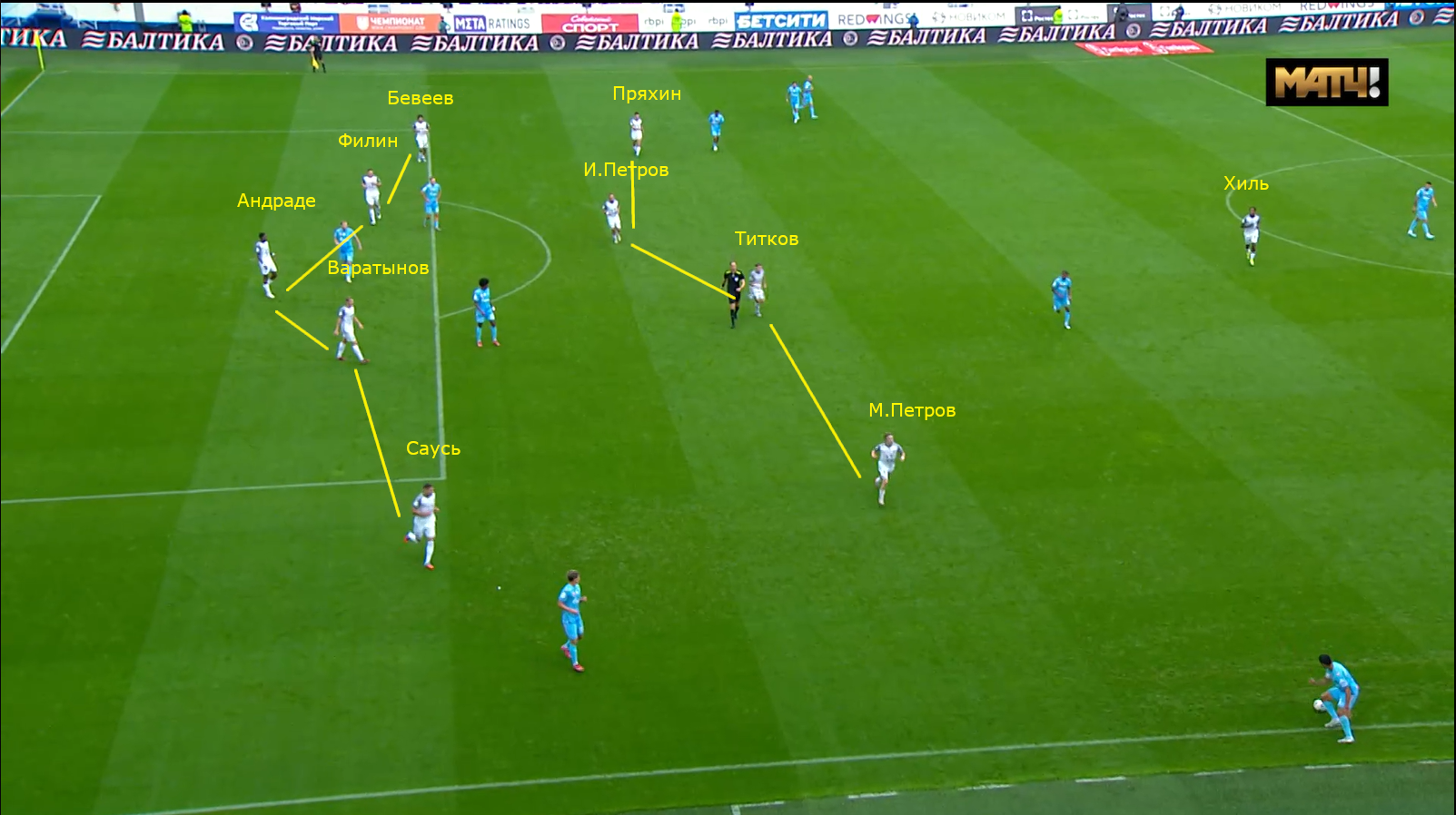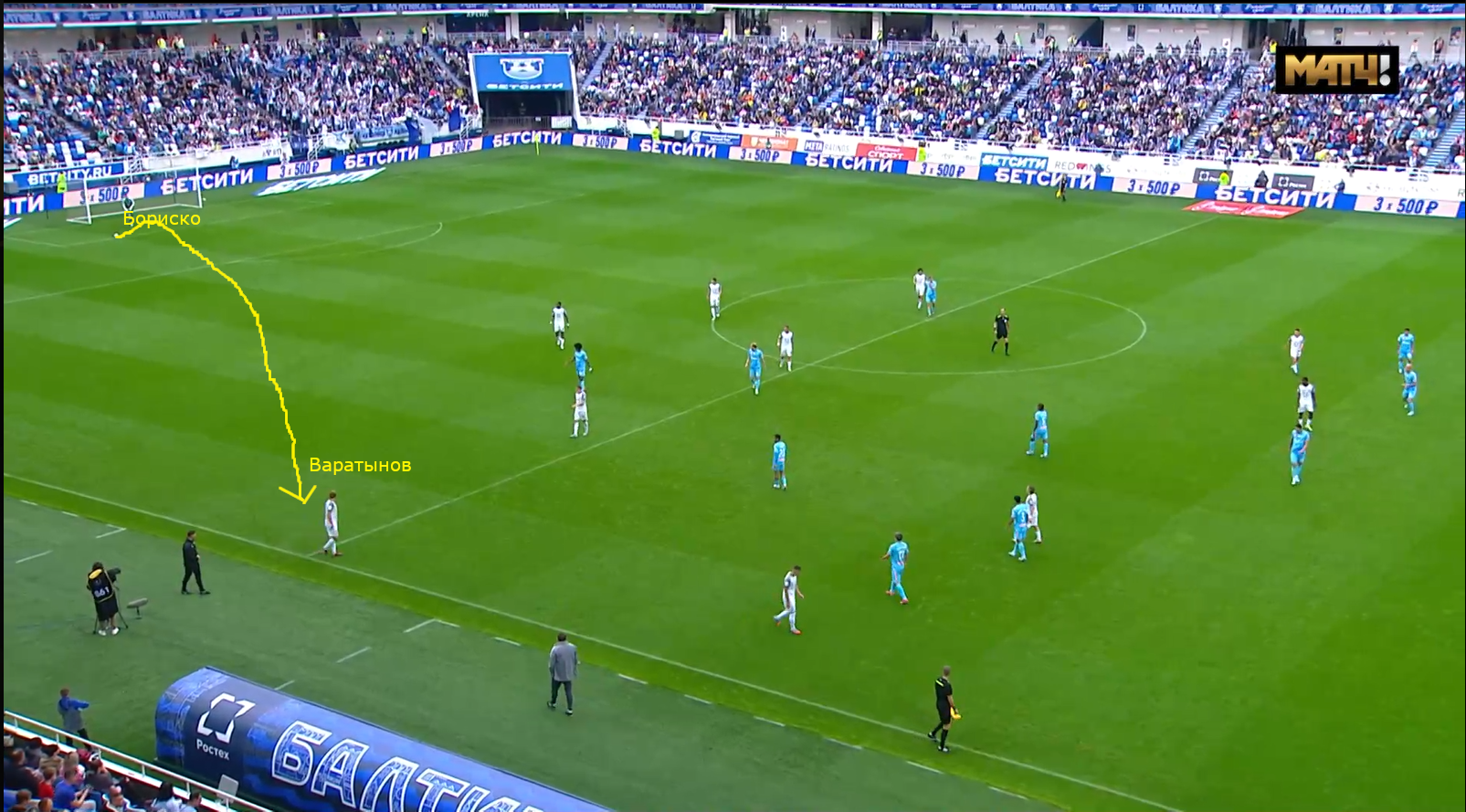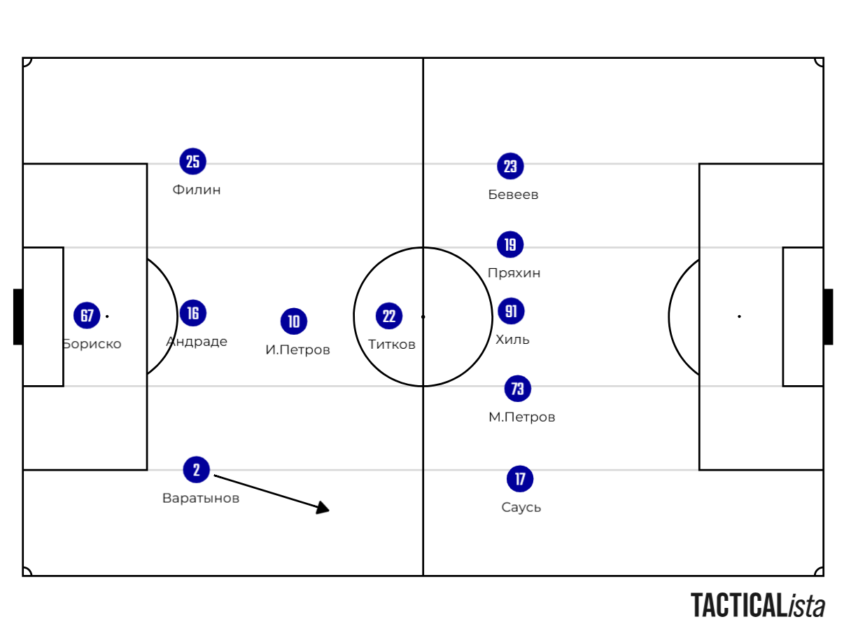 Ну и о направлении начала атак. В большинстве своём «Балтика» начинает свои атаки через фланги. Если мы говорим про левый фланг, то почти всегда идёт заброс Бивеева. Если же говорим про правый фланг, то там уже возможно несколько вариантов: через Варатынова, Сауся, ну или же через Максима Петрова. Но по большей части атаки начинаются именно через Варатынова, и я бы хотел на этом более подробно остановиться. При таком варианте начала атак Варатынов смещается, по сути, на позицию крайнего правого защитника, ну а дальше Бориско делает заброс на защитника «Балтики».