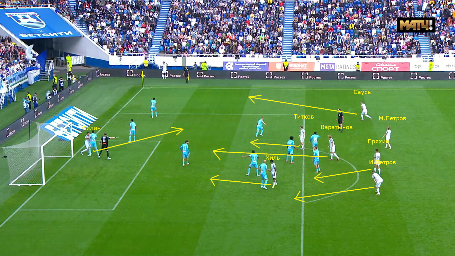 Ну и напоследок решил оставить то, с чем нынешняя «Балтика» Талалаева ассоциируется, — это ауты Бивеева возле чужой штрафной. Вообще, про использование аутов как ещё одного вида стандартов можно очень долго обсуждать, но какой смысл всех этих рассуждений, если на данном этапе они эффективны и приносят опасные моменты и голы? И особенно в этом компоненте в РПЛ выделяется «Балтика». В целом довольно интересный, но простой, как по мне, розыгрыш. Перед исполнением аута, как можем видеть на скрине, в штрафной всего два человека, но при этом ещё шесть находятся за её пределами. И, как видно на скрине, Саусь подбегает к Бивееву для варианта с коротким розыгрышем. Максим Петров остаётся для подстраховки перед штрафной. Остальная четвёрка плюс Хиль смещаются ближе к воротам. Ну и также отметил бы здесь Филина, который смещается с ближней штанги к границе штрафной площадки.
