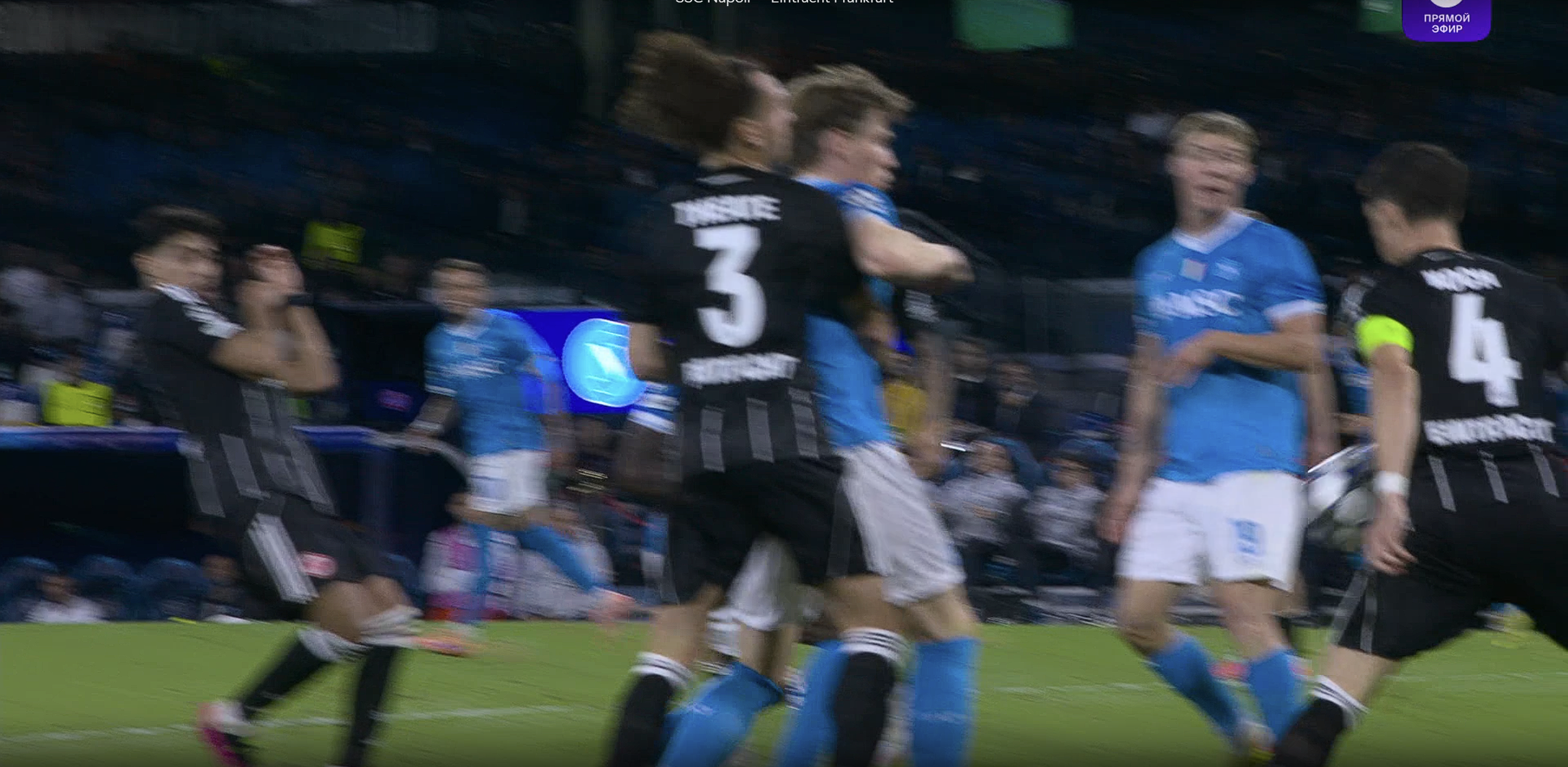 Разница с моментом в Париже в том, что контакт с ногой соперника прошел по касательной, не зажевал ногу в подкате, а в динамике мы видим, что Гравенберх успевает ногу высунуть из тисков. Был бы более плотный контакт и нога осталась бы в «ножницах», увидели бы вмешательство ВАР. В итоге — хорошая желтая карточка от Ковача.
