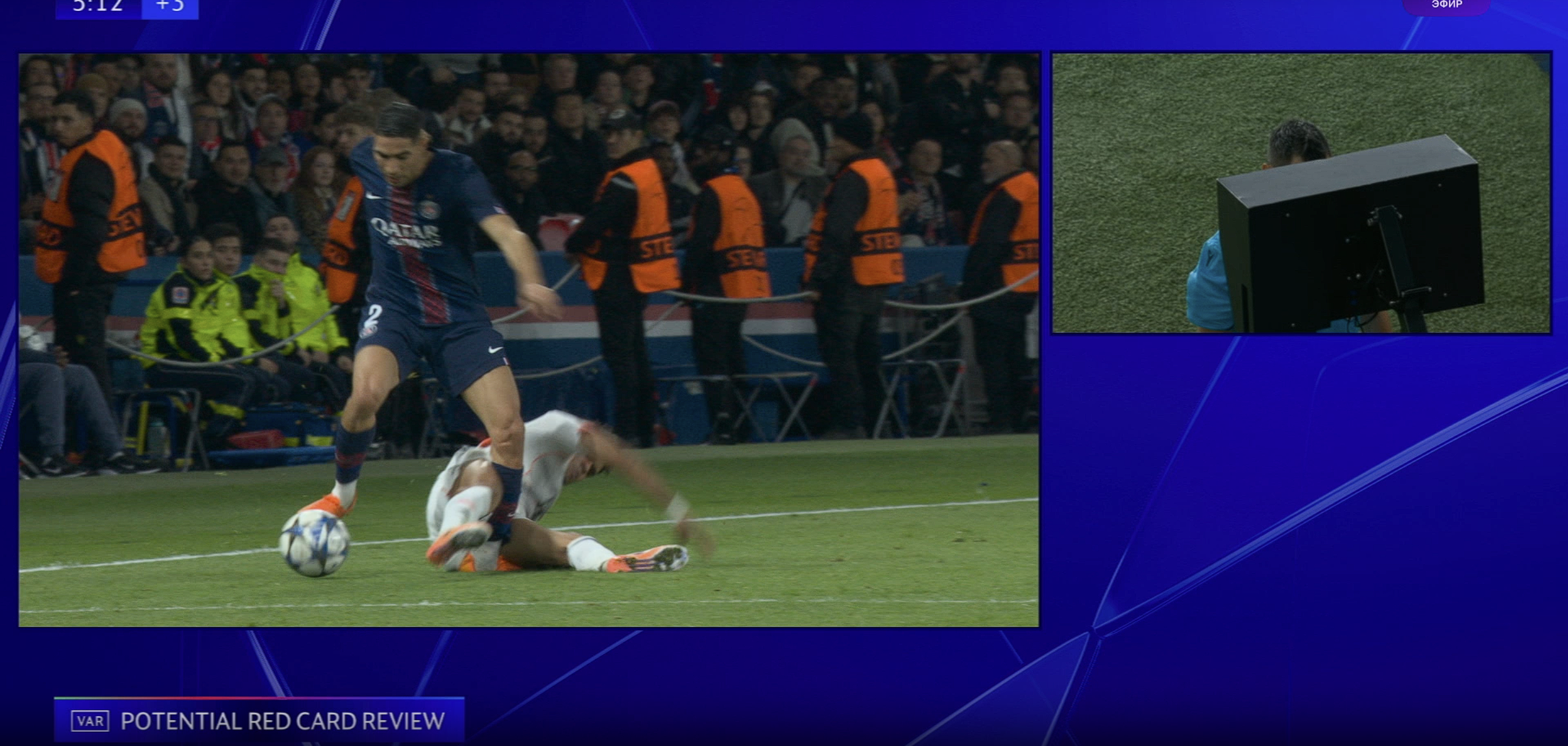 Итальянец Мариани показал желтую карточку в конце первого тайма Луису Диасу за подкат за Хакими. Верно в игру вмешался ВАР. Критерии на красную карточку: прыжок сзади двумя ногами, фаза полета, так называемые «ножницы» (когда две ноги как бы зажевывают ногу соперника), нога Хакими пошла на «слом», а также последствия подката. Думаю, после просмотра монитора у Мариани не было другого выхода, кроме удаления.