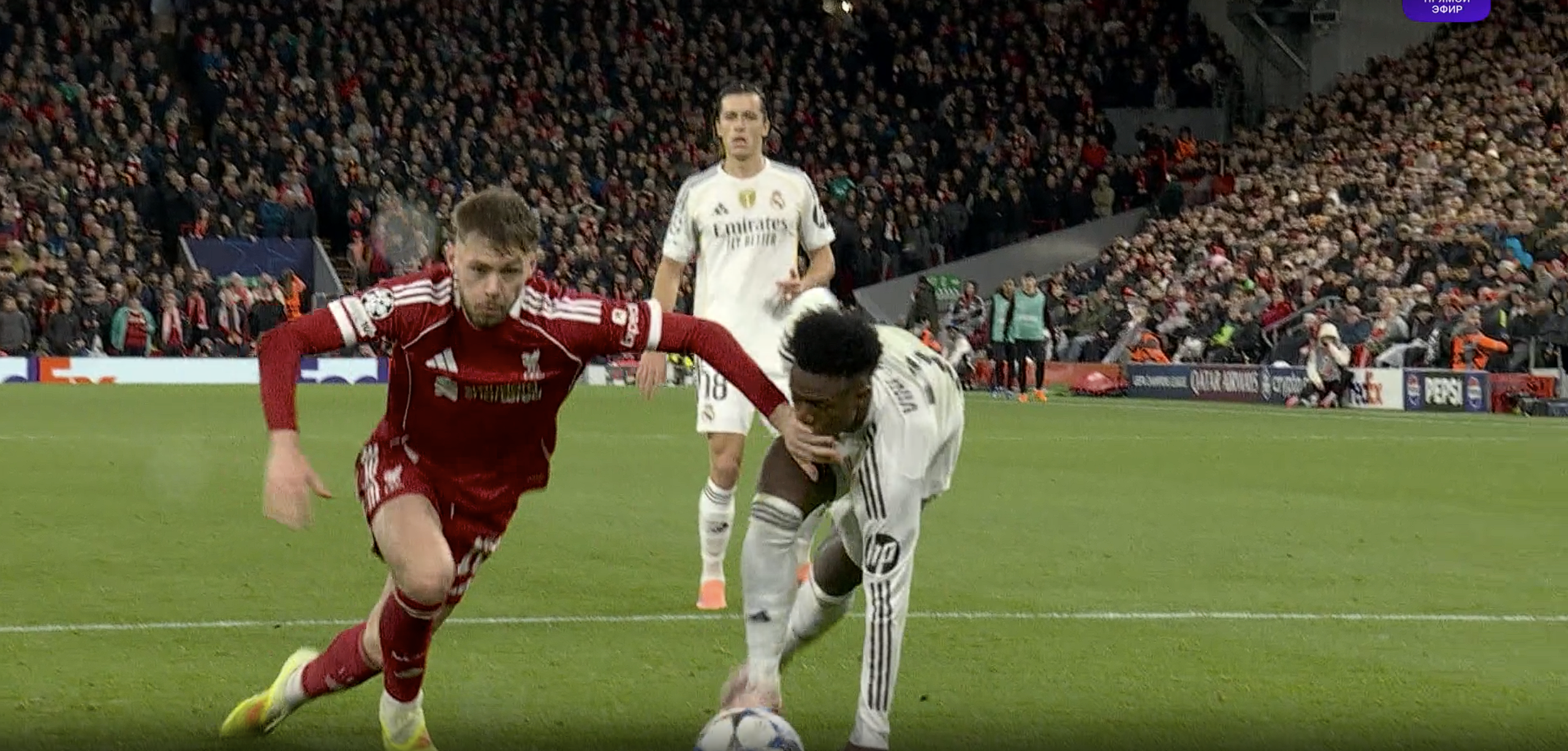 Момент на три решения, на первый взгляд. Винисиус падал красиво — мог бы получить вторую желтую за симуляцию и покинуть поле. Но мы видим на повторах, что у Вини поехала нога — симуляции не было.