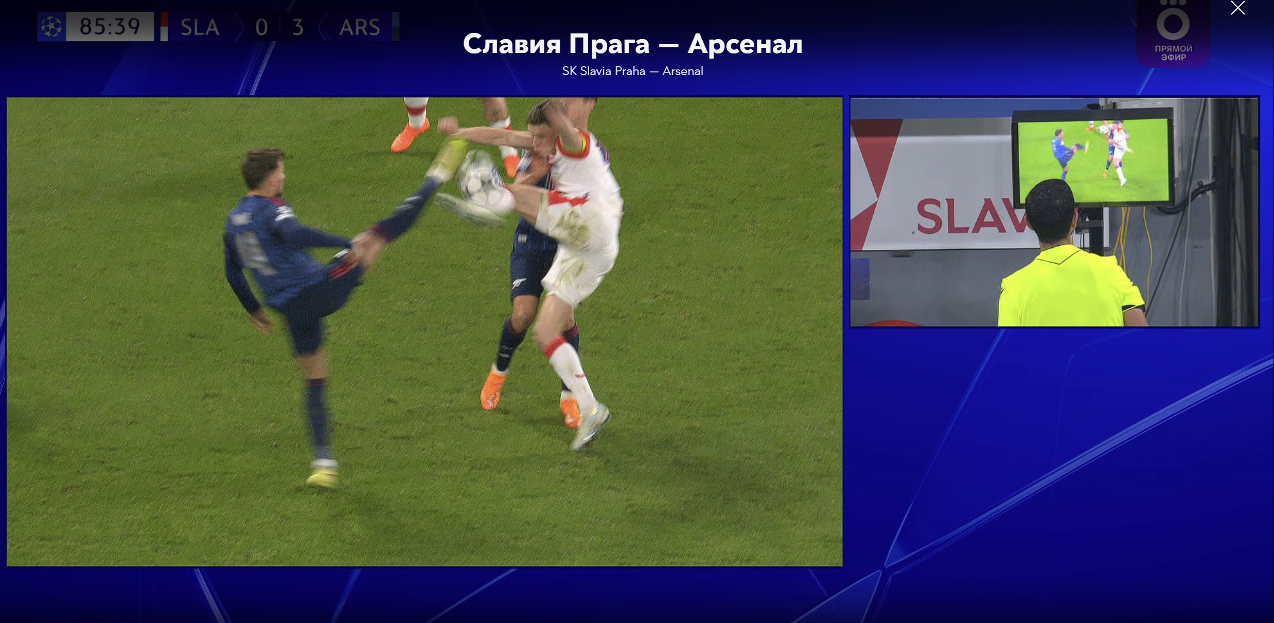 На 86-й минуте Агаев опять ходил к монитору — на этот раз отменять пенальти в ворота «Арсенала». И тут я согласен с решением ВАР, который вмешался в игру. Игрок «Славии» играет в мяч, то же делает в Бен Уайт — успешно блокирует мяч ногой, не совершая движения в игрока соперников. Контакт, который произошел вследствие высоко поднятых ног нужно считать игровым, наказываться он не должен.
