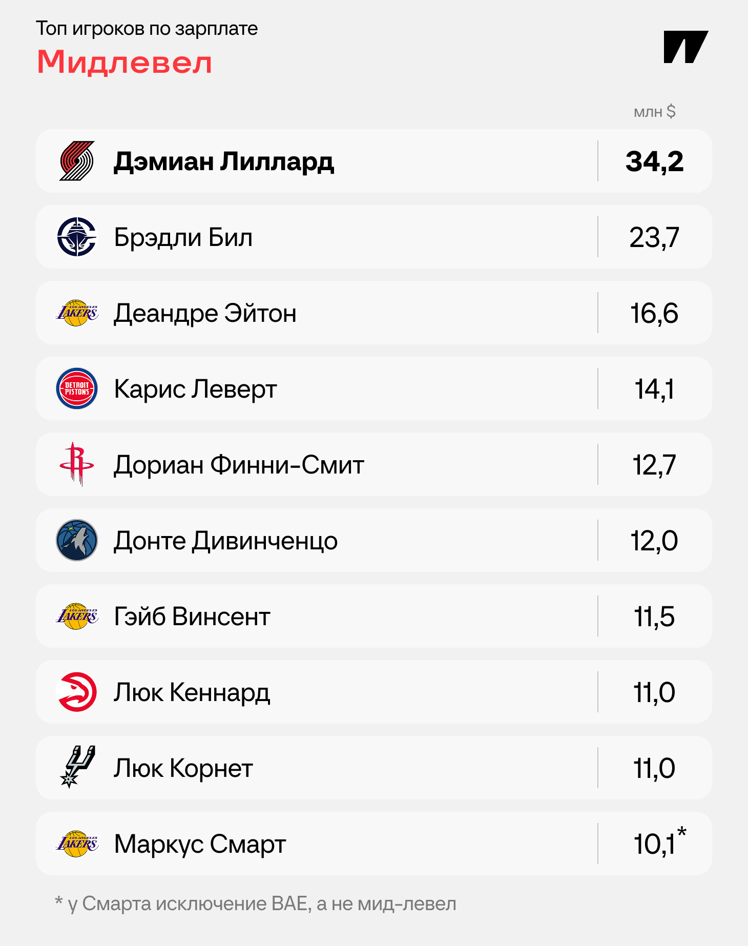 Это игроки, подписанные на «исключение среднего уровня» – такой инструмент, помогающий командам даже при превышении потолка добавить в состав одного-двух хороших свободных агентов для глубины. Но не всегда эти свободные агенты – совсем уж «безработные».
