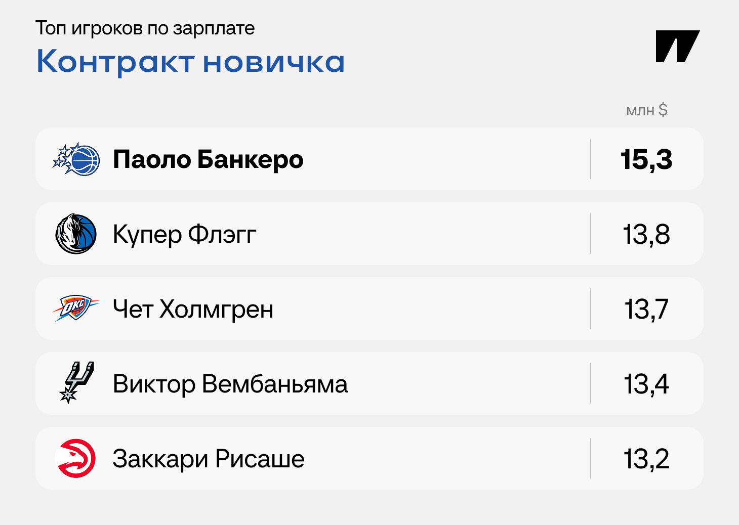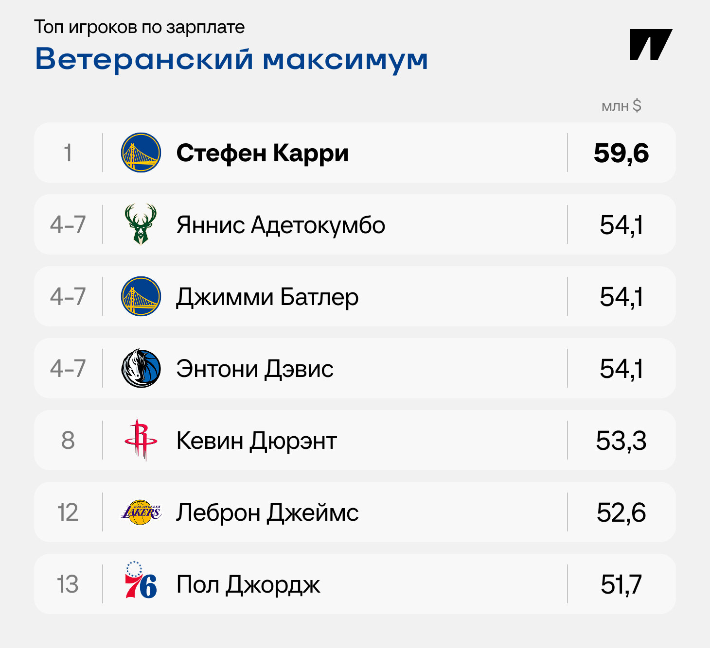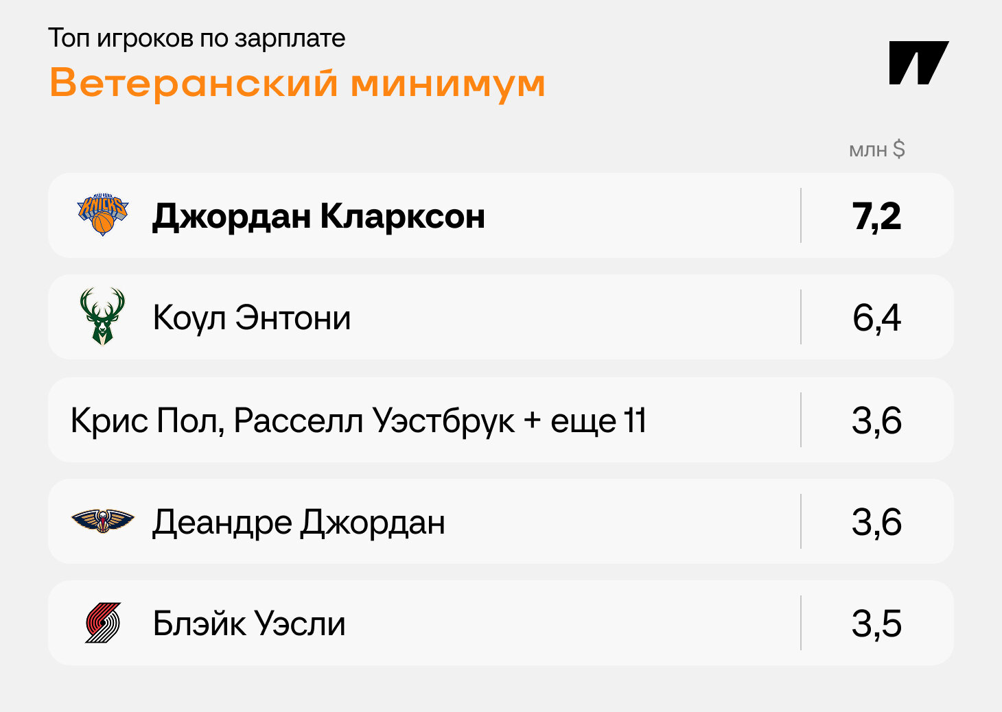 Как и максималка, минималка зависит от стажа. При 10+ сезонах за плечами самая маленькая зарплата, которую может получить игрок – это 3,63 млн (в сезоне-2025/26). Таких игроков в лиге 13, включая Пола, Уэстбрука, Кайла Лаури, Джеффа Грина. Это в районе 300-го места в НБА. А также это выше, чем средняя зарплата в НХЛ.
