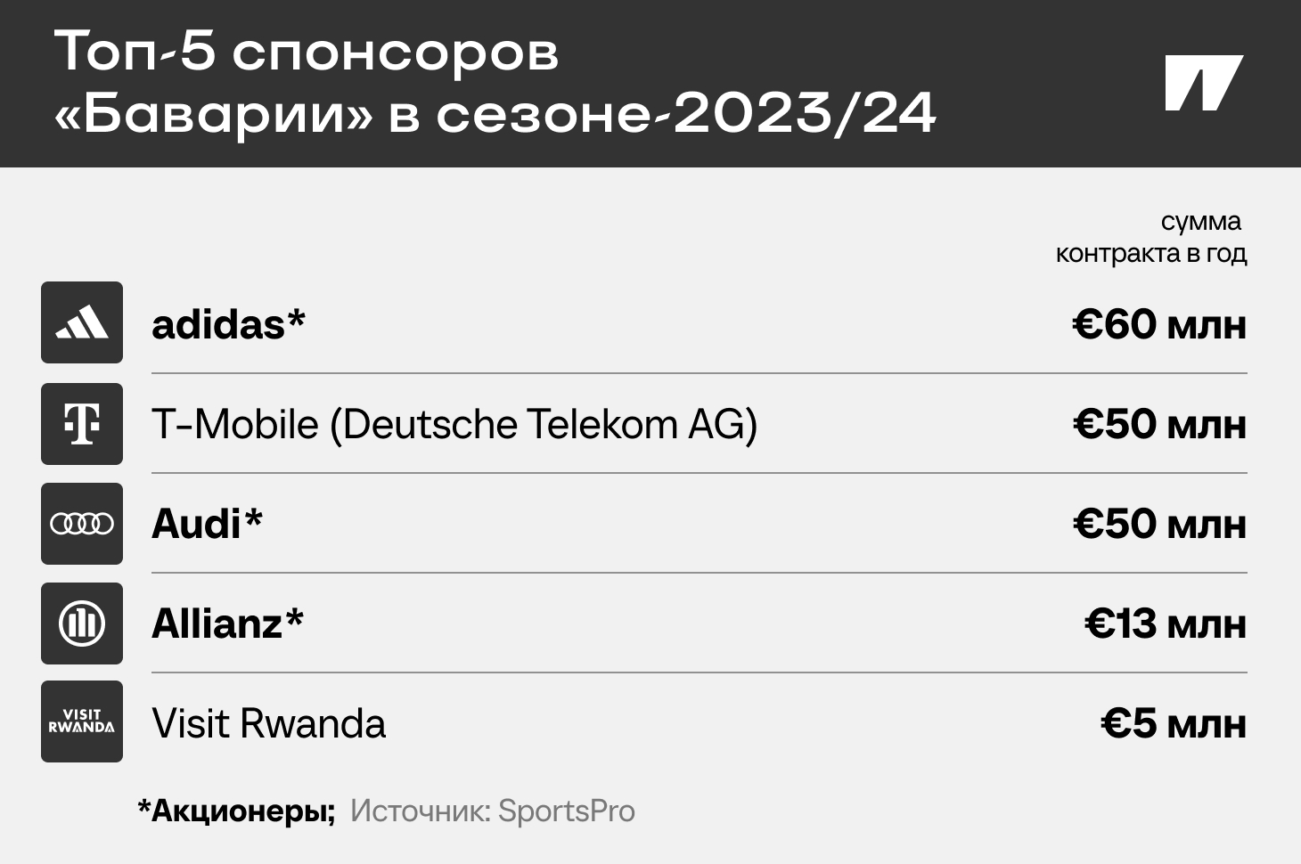 Сейчас в пятерку крупнейших спонсоров «Баварии» входят сразу три основных акционера (у каждого по 8,3% акций): страховая компания Allianz (общие активы оцениваются в 900 млрд евро), автоконцерн Audi (70 млрд) и спортивный гигант adidas (20 млрд евро).