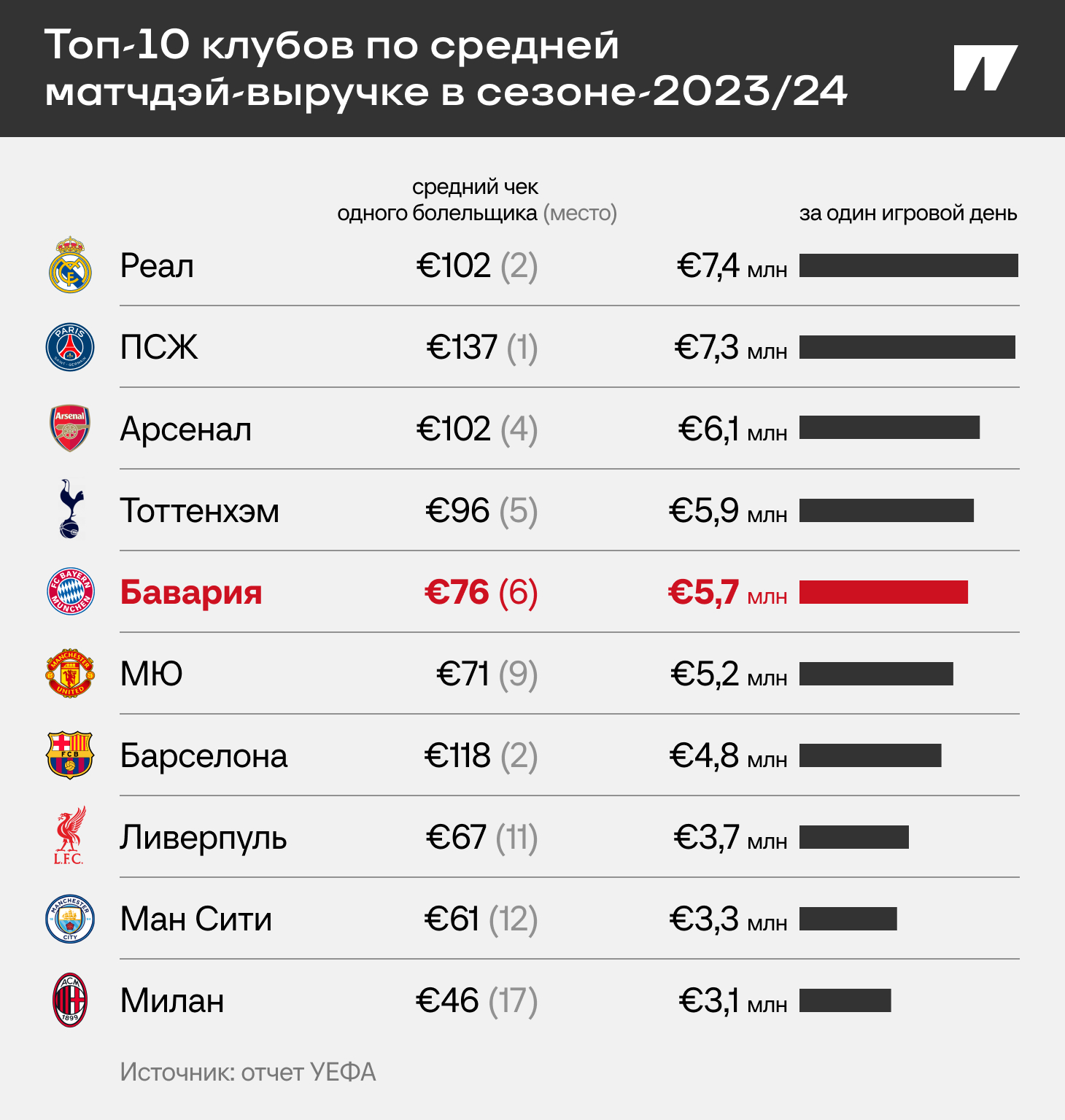 Мюнхенцы высоко по сборам с одного игрового дня (5,7 млн евро) и по среднему чеку от одного болельщика (76 евро). Правда, на играх «ПСЖ» посетитель тратит почти в два раза больше. Цены на матчи «Баварии» остаются сравнительно низкими во многом из-за правила 50+1 (с конца 90-х в футбольной Германии болельщики должны иметь большинство при принятии основных управленческих решений, чтобы избежать захвата власти заграничными инвесторами).