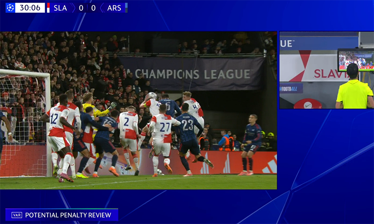 Даже пенальти «Арсеналу» теперь приходят со стандартов: на 29-й минуте после подачи Букайо Сака с углового и удара головой Габриэла Магальяэса мяч попал в руку форварду Лукашу Проводу. Судья Алияр Агаев сначала проглядел, но включились видеоассистенты – восстановили 11-метровый. Сака реализовал.