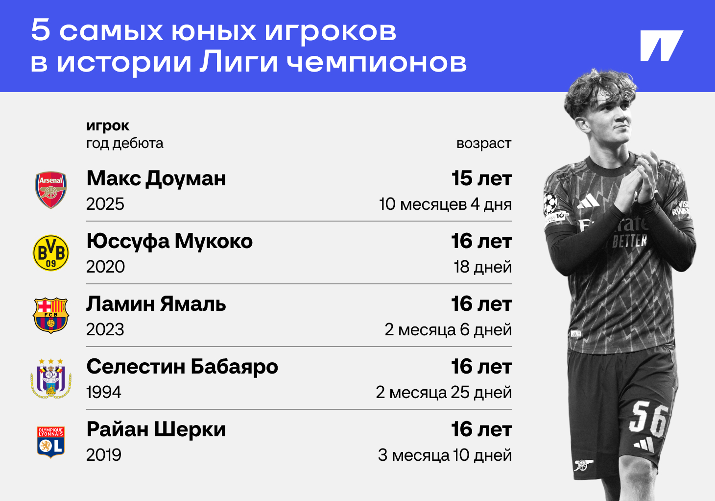 Появлением против «Славии» Доуман сместил Александра Павленко на 15-е место в рейтинге юнцов. Россиянин выходил в 16 лет, 9 месяцев и 11 дней за «Спартак» против «Фейеноорда» в октябре 2001-го. В топ-15 еще, например, Брайан Кристанте, Мойзе Кин, Уоррен Заир-Эмери и Юри Тилеманс.