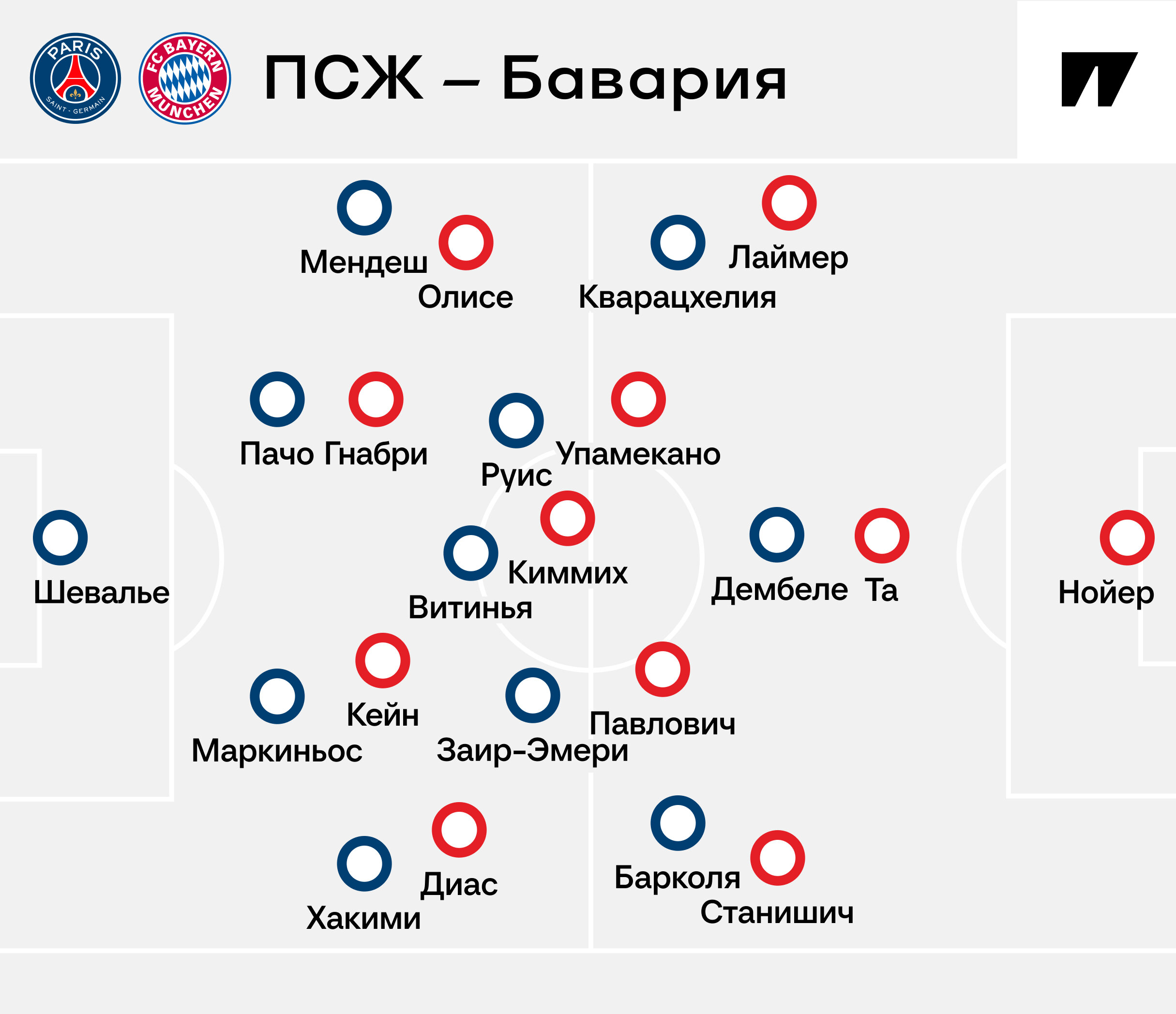 Вас может смутить расстановка выше из-за позиции Дайо Упамекано, но на самом деле он иногда оказывался еще выше. «Бавария» как всегда прессинговала персонально, по Усману Дембеле играл напарник Упамекано в центре защиты Джонатан Та, по Хвиче Кварацхелии и Брэдли Барколя действовали крайние защитники Конрад Лаймер и Йосип Станишич, а Упамекано…