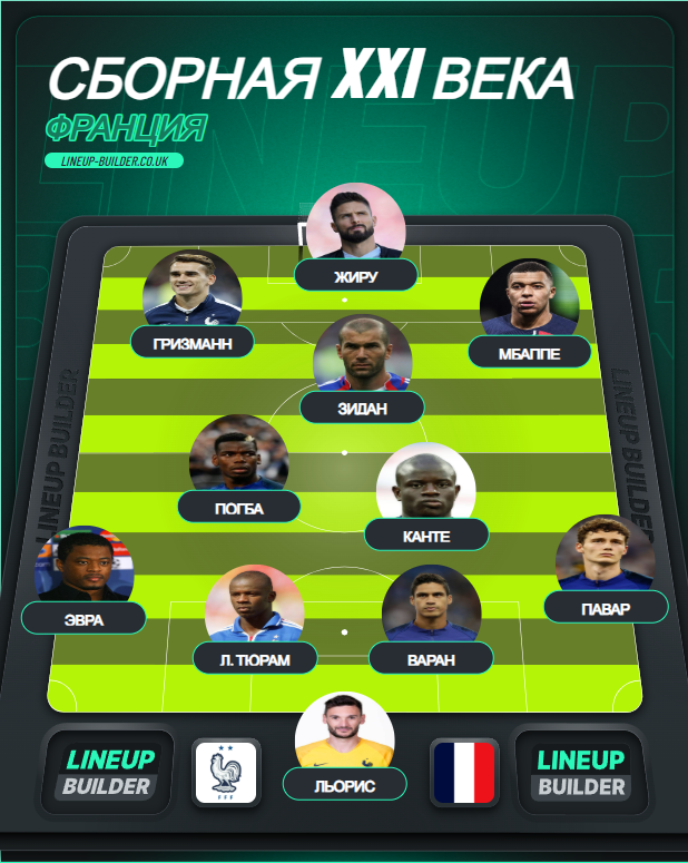 Атакующие полузащитники: ЗинединЗидан и Антуан Гризманн. В данном случае сложно выделить именно роли на тактической доске, но наличие в составе абсолютно точно. Первый за перформанс на ЧМ 2006, и супер кэмбек в матче с Англией на Евро-2004. Есть и провальный ЧМ 2002 из-за травмы, но он не испортит ощущение от сборной начала 21 века. Это была команда - Зизу.
