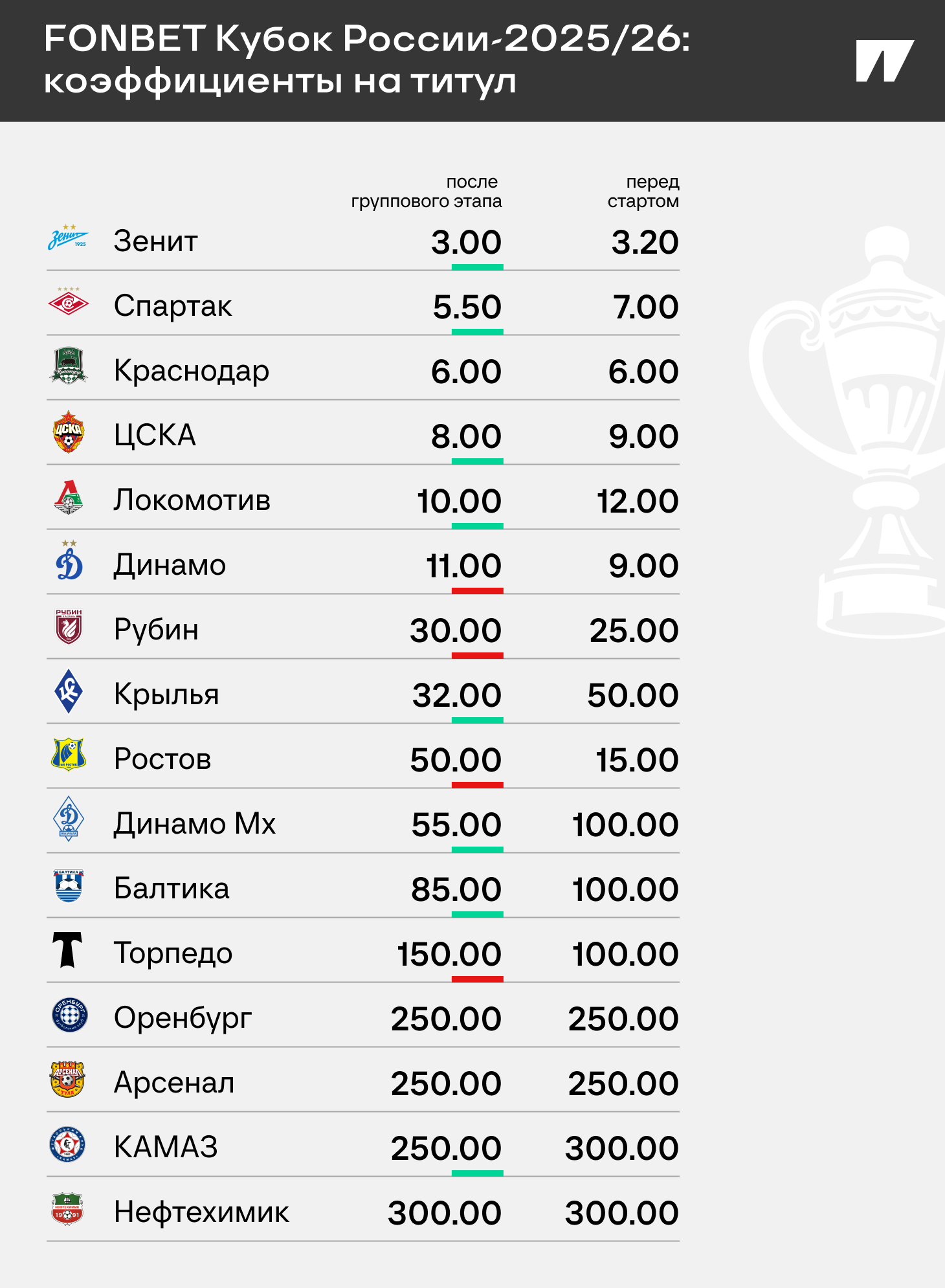 FONBET Кубок России перешел в стадию четвертьфиналов – и там за последние пару недель есть изменения по раскладам: «Зенит» стал еще большим фаворитом против «Динамо», шансы внезапно увеличились и у «Спартака» против «Локомотива».
