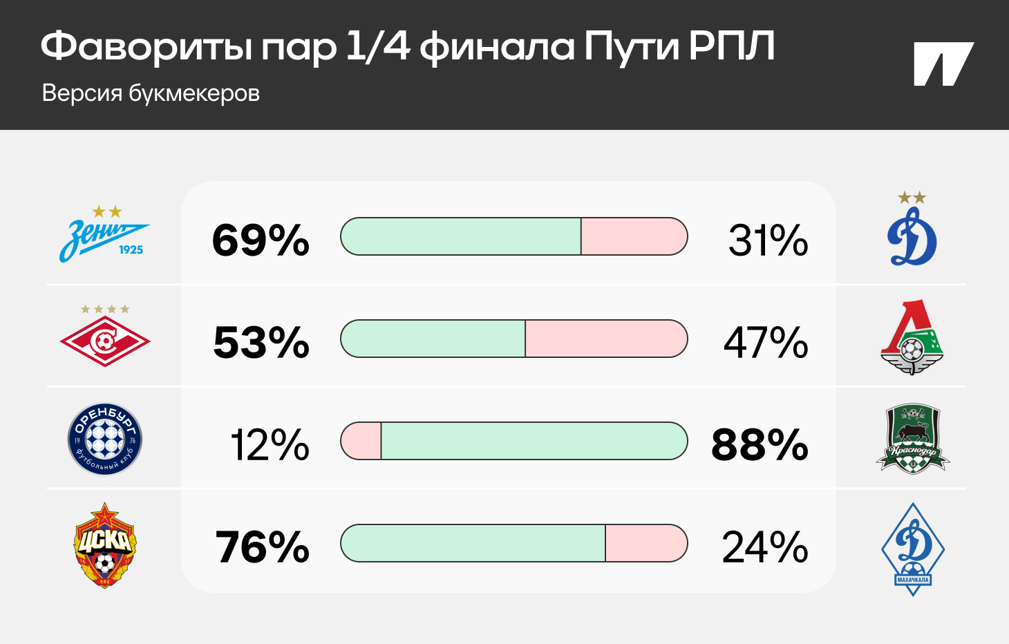 «Зенит» – на 69% фаворит против «Динамо», в «Спартак» верят чуть больше, чем в «Локо»