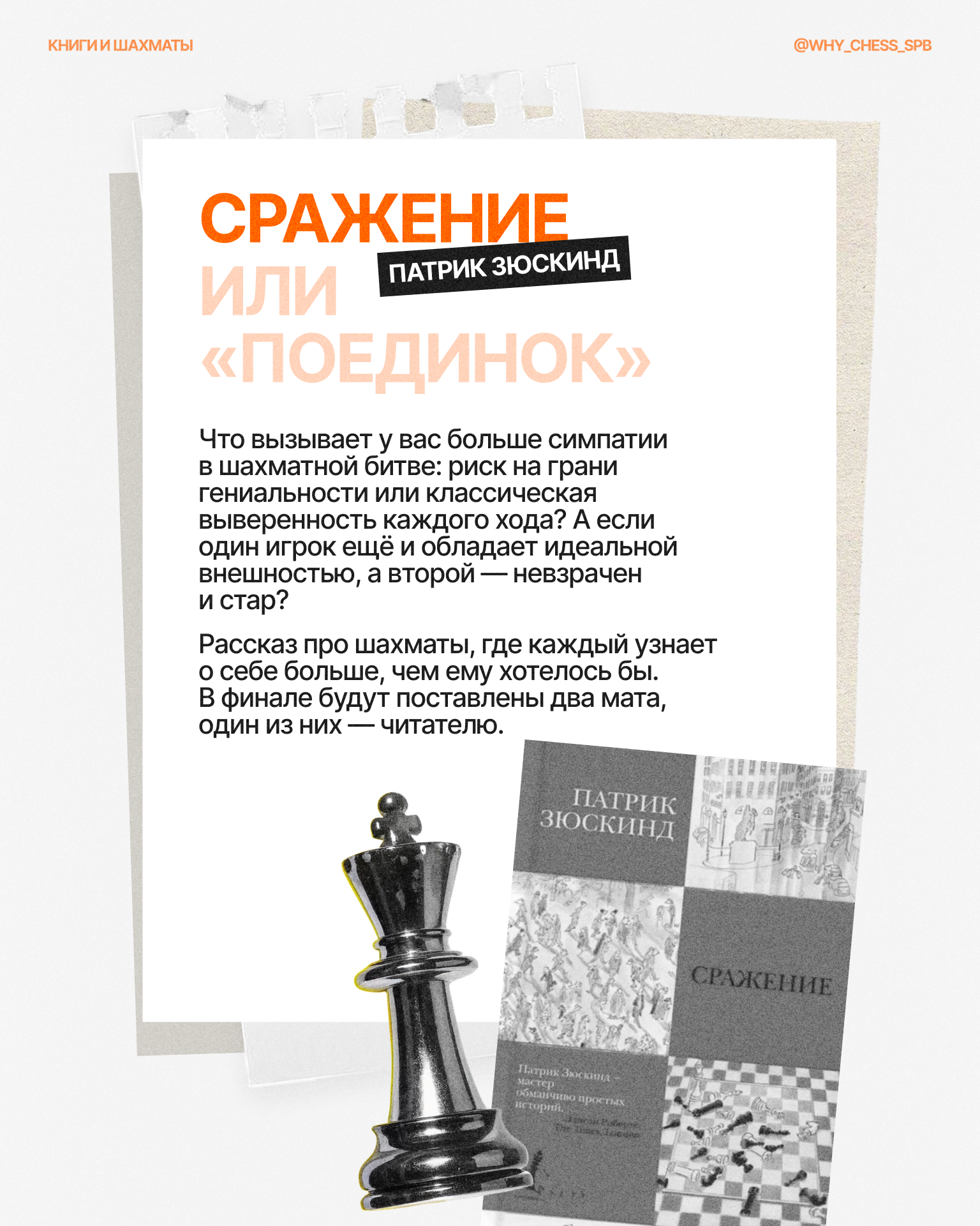В «Сражении» Зюскинд на нескольких страницах за счет одной партии показывает противостояние не только игроков, но и разных общественных взглядов, ведь шахматы так же являются идеальной метафорой конфликта и борьбы противоположностей, потому что необходимость победить соперника заложена правилами игры.