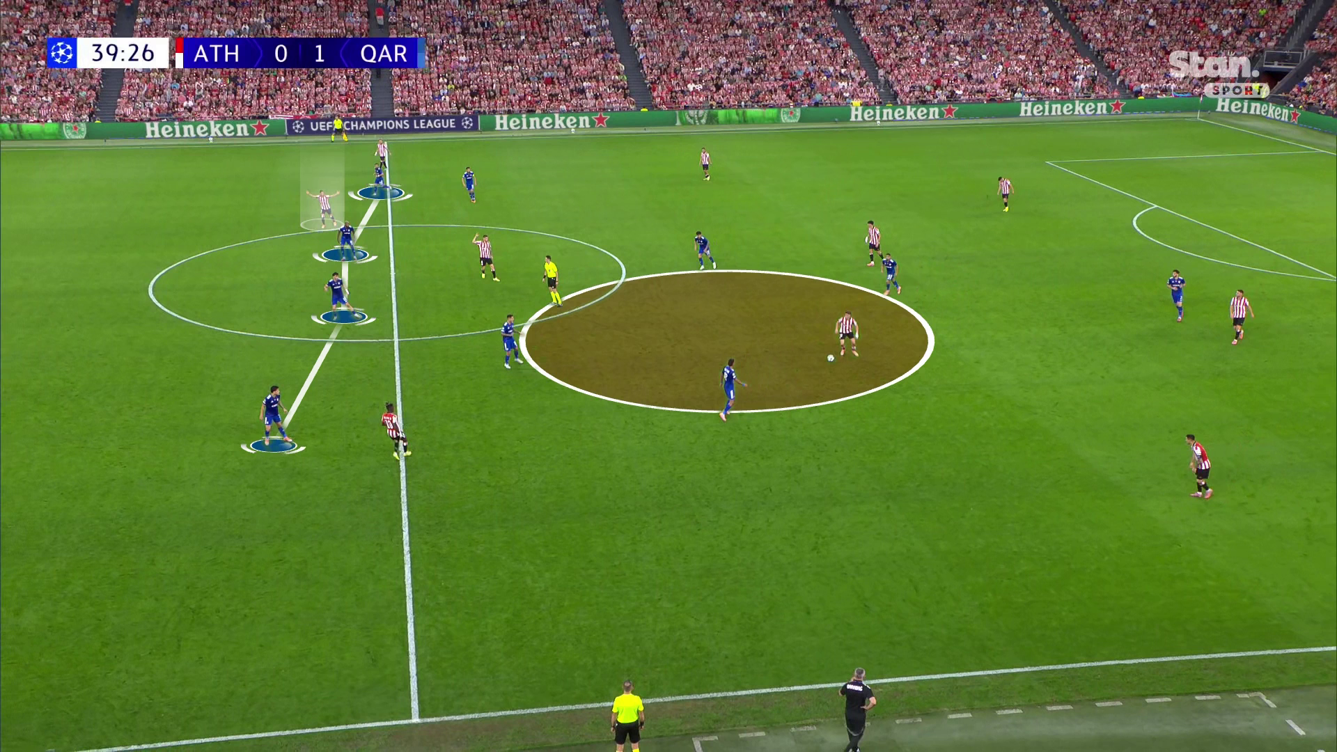 При игре с такой высокой линией нужно постоянно оказывать давление на мяч – иначе свободный соперник забросит на опасный выход. К сожалению, «Карабах» слишком часто застревает в сценарии с высокой линией, но без нужного давления. Ярче всего это вскрыл «Атлетик»: