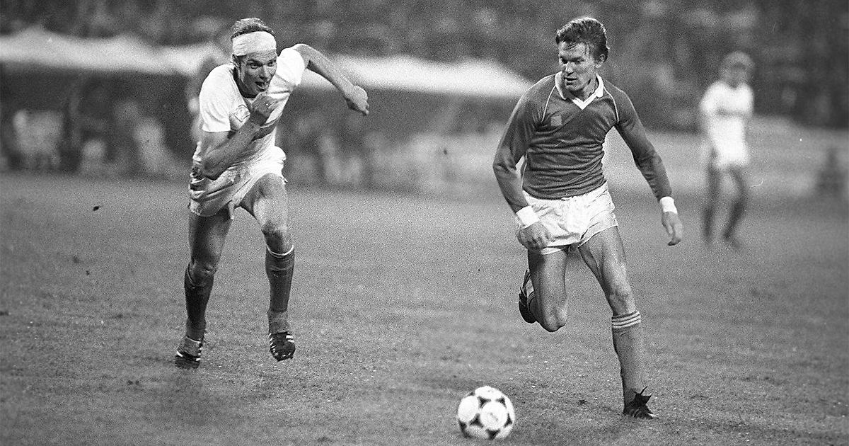 ...В борьбе за мяч опытные и знаковые Ветераны Советского Футбола - О.БЛОХИН (с мячом) - он, впрочем, не только Ветеран, но и один из главных Символов Футбола СССР!.. и защитник Спартака (а в недавнем прошлом и моск.«Динамо») - А.БУБНОВ... Для А.Бубнова сезон был скорее удачным. Он вновь на постоянной основе вернулся в Сборную СССР.