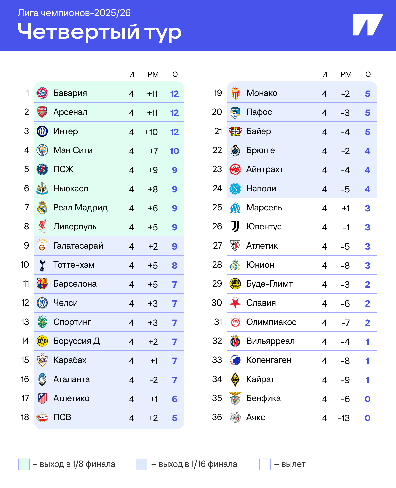 Теперь таблица: без потерь пока идут «Бавария», «Арсенал» и «Интер».