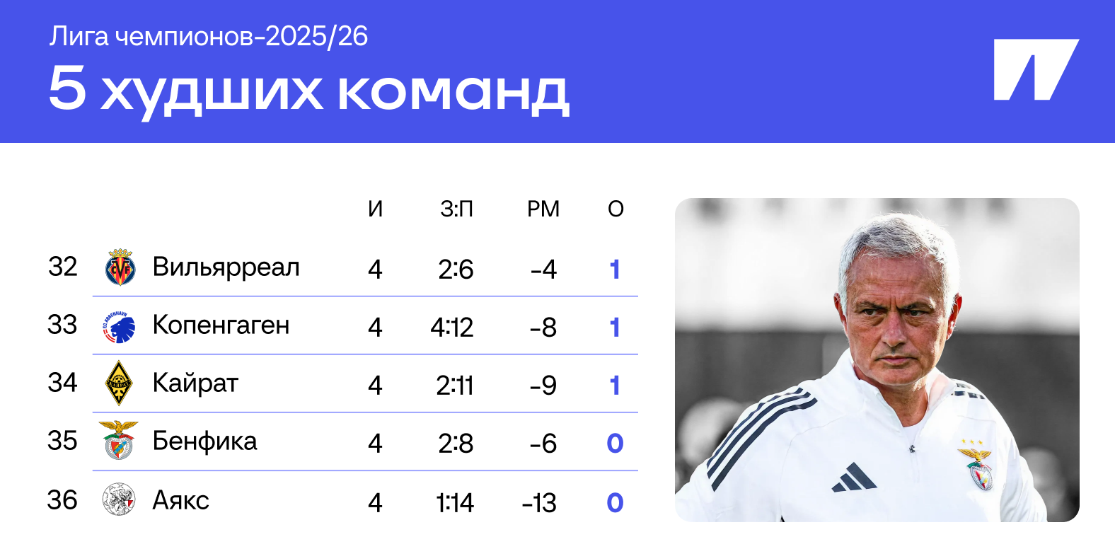Вот такие имена в нижней пятерке после четырех туров Лиги чемпионов: «Вильярреал», «Аякс» и «Бенфика».