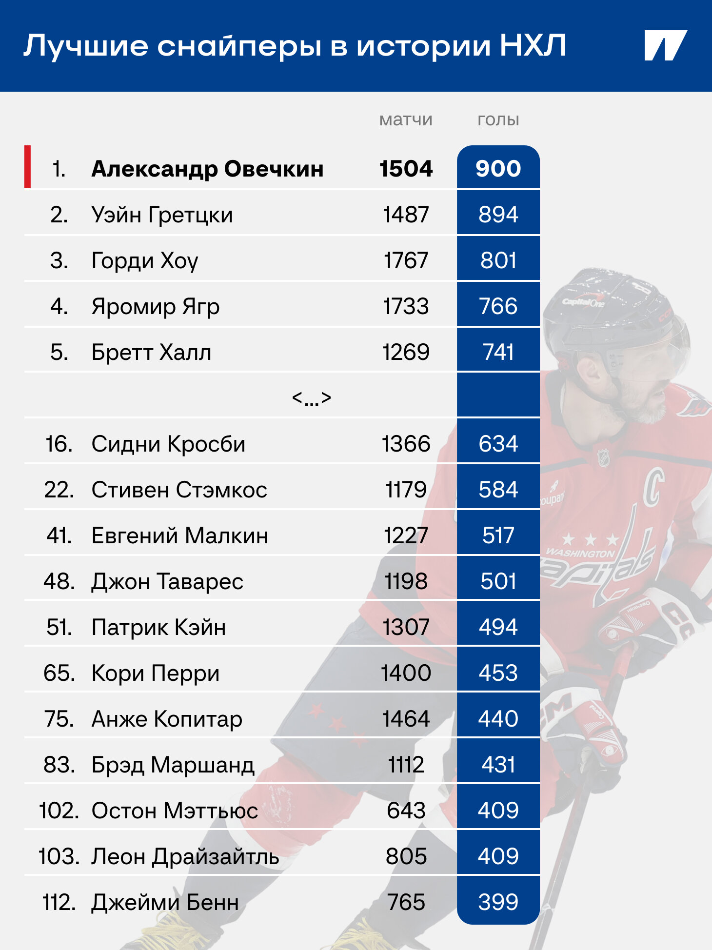 Обновленный топ снайперов в регулярках НХЛ выглядит так. Овечкин упрочил лидерство. Из действующих игроков ближе всех к нему Сидни Кросби, но он отстает аж на 266 голов! К топ-100 подбирается Остон Мэттьюс – теперь все внимание на нем. Стивен Стэмкос уже не выдержал голевое соревнование с Овечкиным. Справится ли капитан «Торонто»?