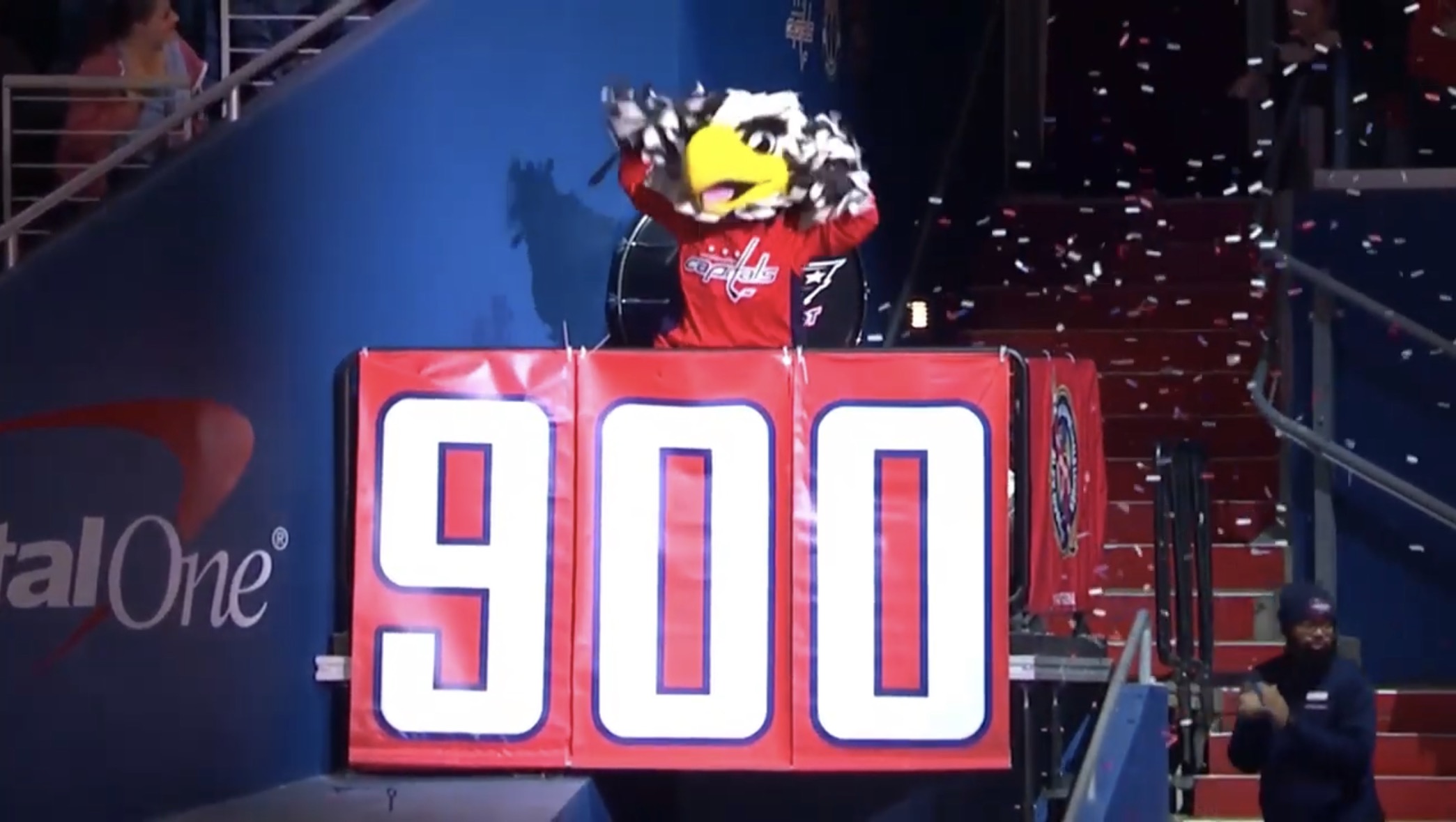 Матч остановили на несколько минут – стадион чествовал юбиляра. Маскот «Вашингтона» заводил толпу, но люди и так уже были в экстазе.