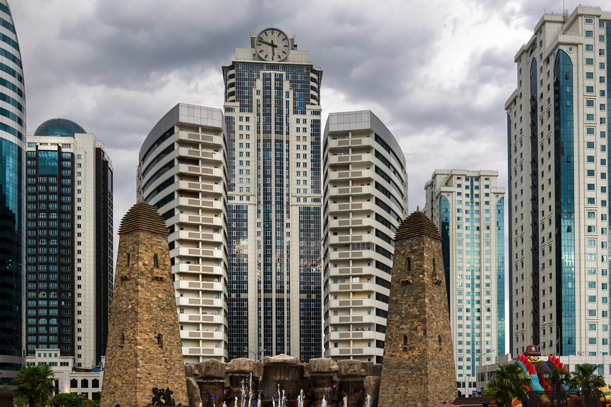 Семь башен «Грозный-Сити» рисуют на небе современный профиль чеченской столицы. Строительство комплекса завершилось в 2011 году, подарив городу ультрасовременный деловой квартал. Самый высокий небоскреб взмывает ввысь на 145 метров – 45 этажей, где стекло встречается со сталью.