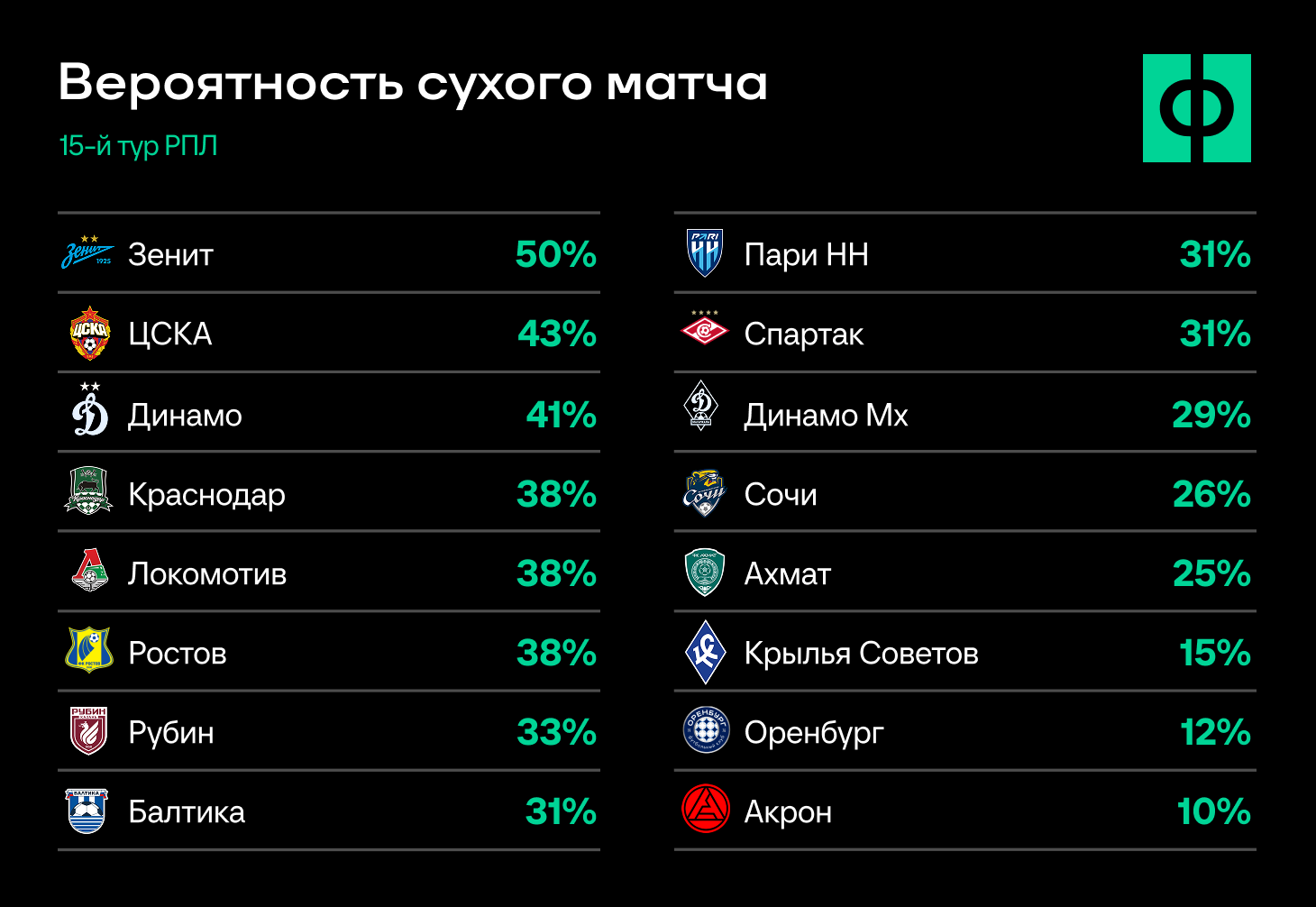 ● «Ростов» – в топ-5 претендентов на сухой матч, хотя сыграет в гостях. Сомнительный прогноз: «Сочи» недавно положил четыре «Ахмату» в Грозном, забил и в Оренбурге, атака у команды качественная. «Ростов» сыграет без дисквалифицированного Роналдо. «Сочи» очень мотивирован по таблице: есть возможность покинуть зону вылета до зимнего перерыва.