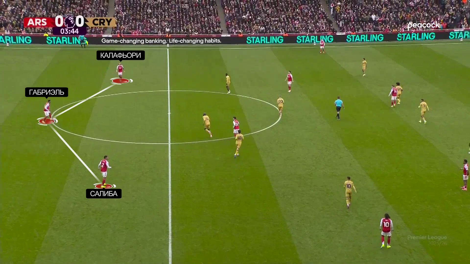 Против «Кристал Пэлас» более тонкая надстройка. На месте фирменная структура «Арсенала» 3+2, но с Риккардо Калафьори в роли третьего центрального. Обычно итальянец действует выше. Нередко поднимается в атаку, а иногда даже выступает дополнительным форвардом. Здесь учли сильный правый фланг «Кристал Пэлас» (связка Сарр+Муньос) и решили опустить Калафьори пониже. А атакующие функции взял умница Юрриен Тимбер с правого фланга, который может, кажется, вообще все.