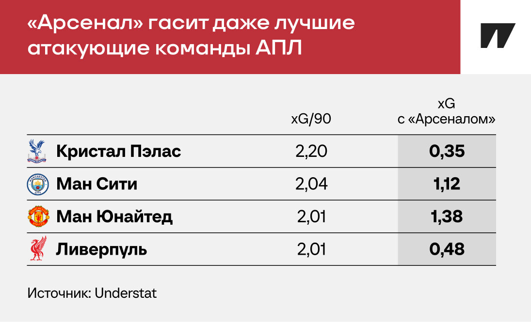 «Арсенал» из этой серии не просто выкрутился, пропустив всего дважды. А еще тотально загасил атаки. У каждой команды – резкая просадка при встрече с «Арсеналом». На более-менее своем уровне выступил только «Манчестер Юнайтед». Остальные выдавали либо худшие атакующие перфомансы, либо близкие к худшим.