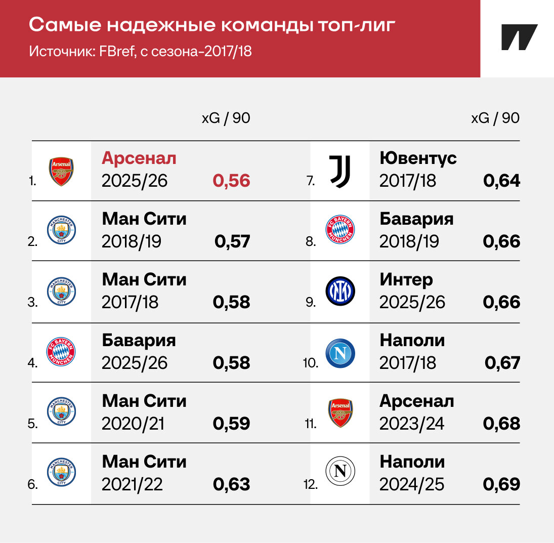 Это главный аргумент заявки «Арсенала» на рекорд. Не просто сильная оборона, а исторически сильная оборона. Со старта сезона-2017/18 в Европе не было ни одной команды, которая бы допускала так мало моментов.