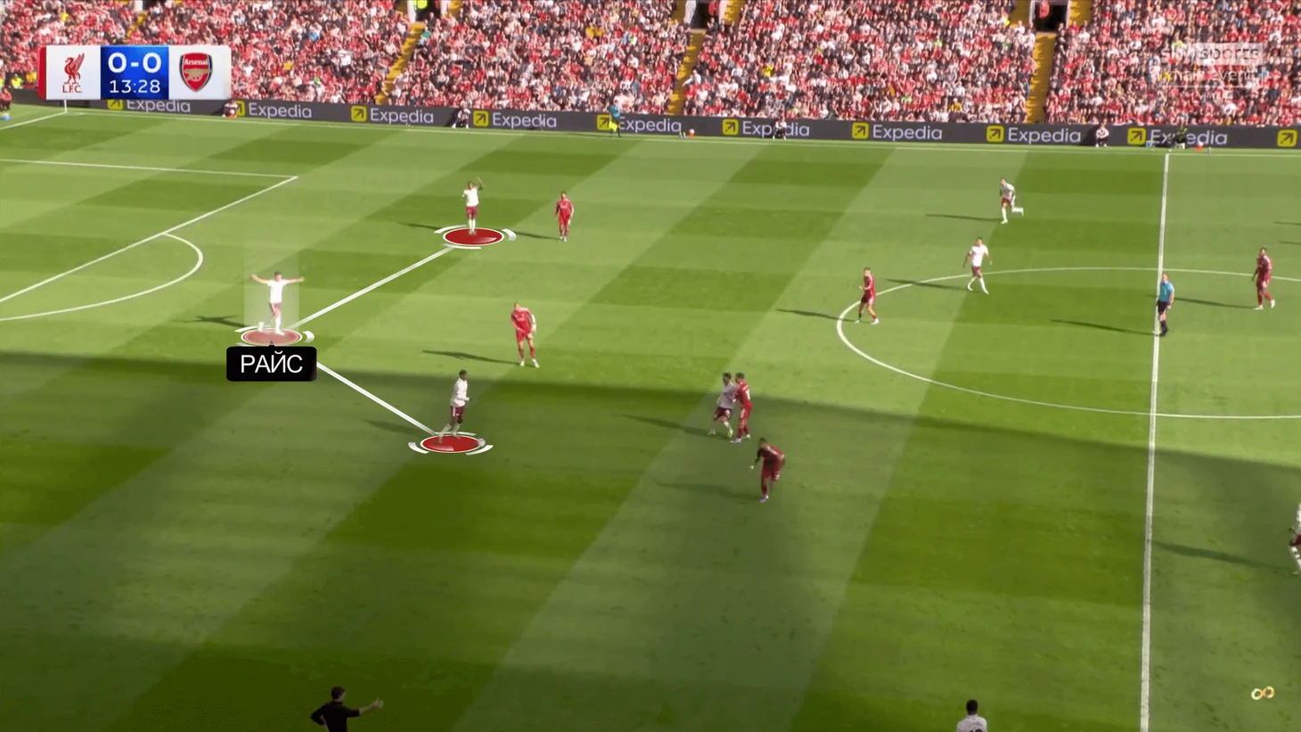 Против «Ливерпуля» использовалась структура, в которой к центральным защитникам регулярно опускается Деклан Райс. Редкий ход для Артеты по карьере, но пригодился против команды, которая любит прессинговать соперников, играющих низом.