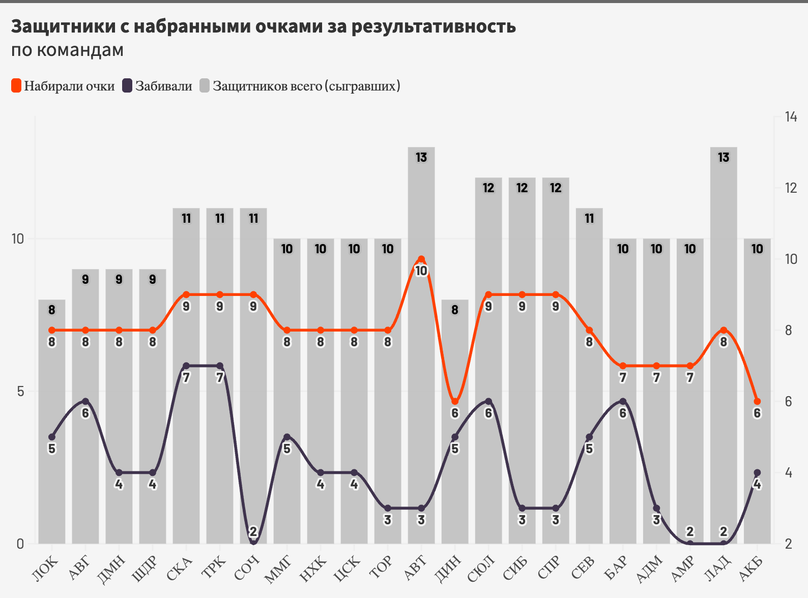 Хорошо видны также и худшие 5 команд по % голов защитников — команды с 7,25% и ниже. Это либо философия игры «всё через слоты под форвардов», либо недостаток трафика перед воротами и редкие подключения защитников вглубь. Однако, несмотря на низкий процент шайб защитников — и Торпедо, и Нефтехимик сейчас находятся в топ-10 турнирной таблицы КХЛ. А Барыс, лидирующий по этому показателю — лишь 18-й. Впрочем, в случае Барыса активность защитников может компенсировать недостаток исполнителей в атаке.
