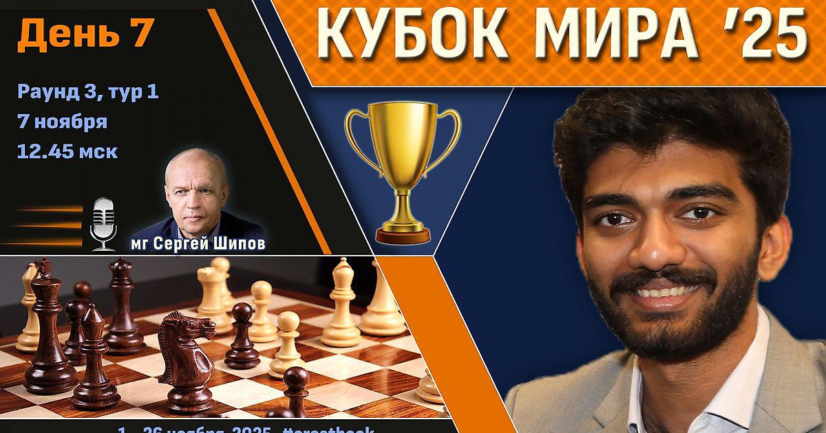 Кубок Мира 2025 🏆 День 7 [1/32, тур 1] ⏰ 7 ноября, 12.45 🎤 Сергей Шипов ♛ Шахматы