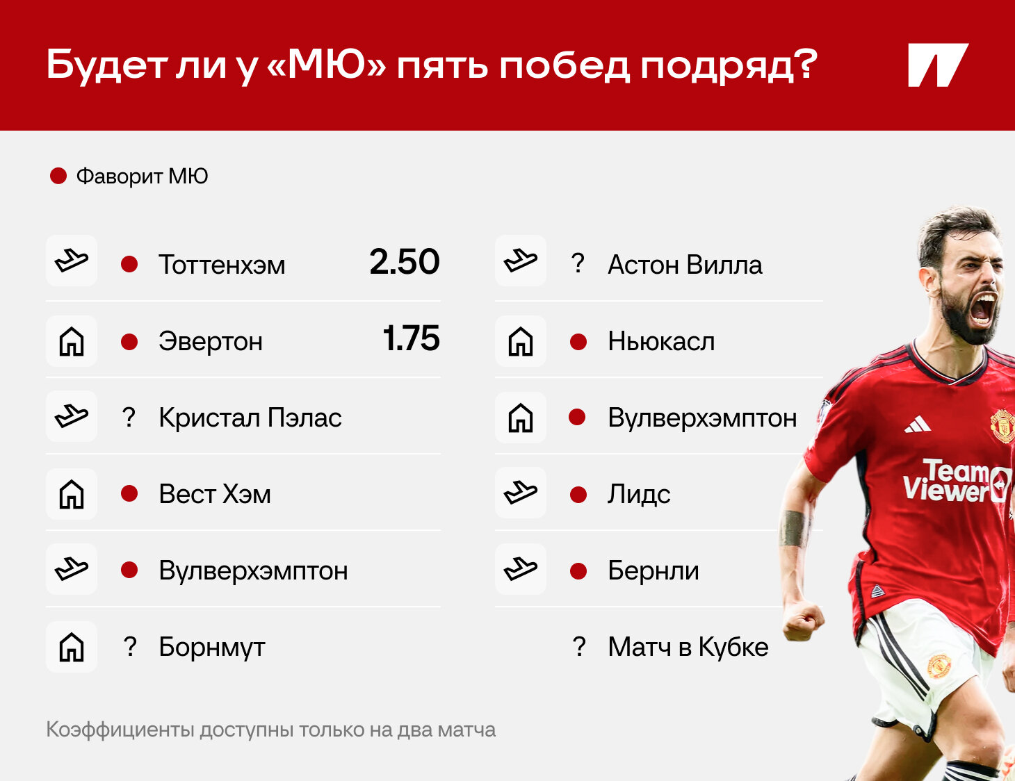 ● Букмекеры ранее оценивали вероятность пятиматчевой победной серии «Юнайтед» в 33%.