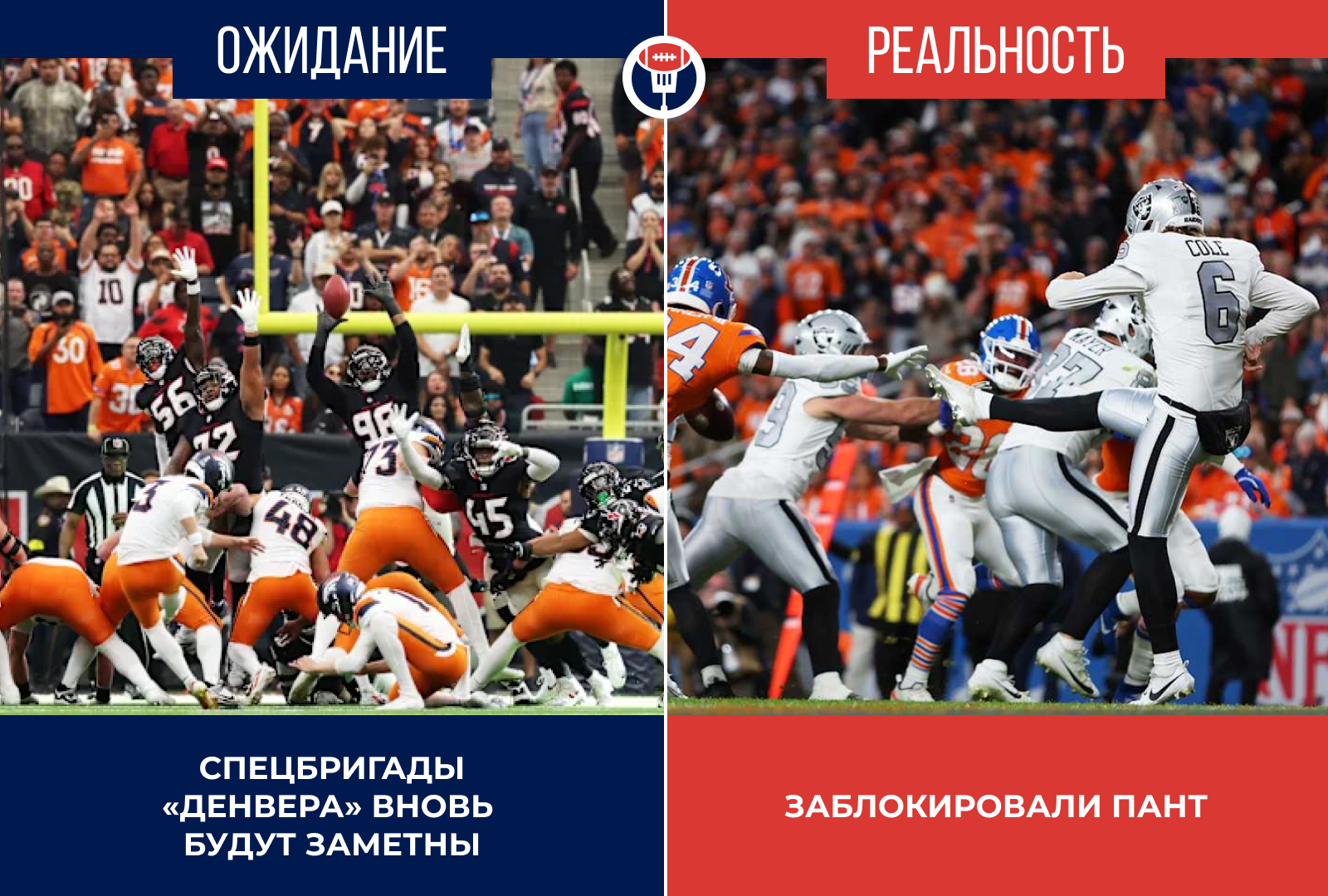 Здесь, конечно, надо похвалить и «Денвер». После смазанного 59-ярдового филд-гола и очередных незатейливых три-и-аут команде нужна была подобная искра. Они ее получили. Пламя не возгорелось, но именно данный эпизод оказался определяющим для исхода игры (затем еще и филд-гол забили). Ну, а Коул присоединился к коллеге из «Бакканирс» Райли Диксону. Только у них двоих больше одного заблокированного панта в этом сезоне.