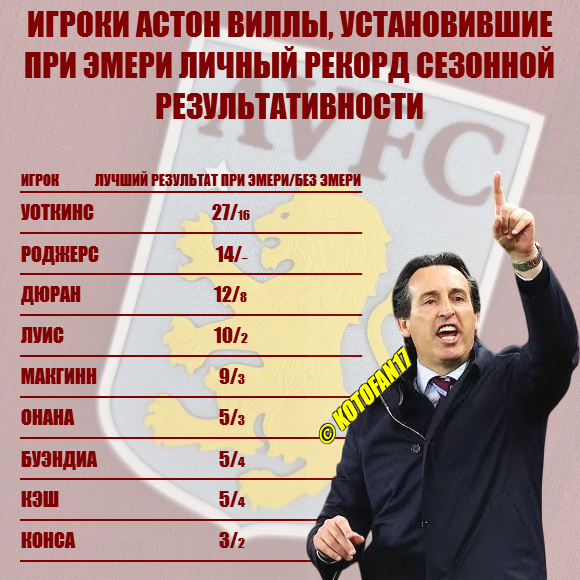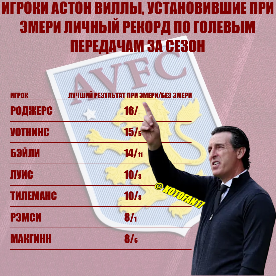 В Астон Вилле, равно как и в Вильярреале, целый ряд игроков установил при Эмери личный рекорд сезонной результативности.