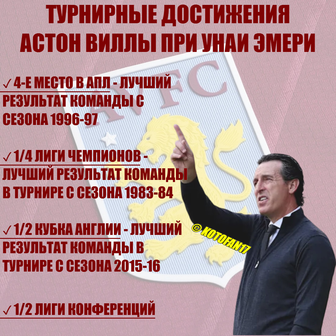 В сезоне 2024-25 Астон Вилла добилась высоких сразу в трёх турнирах: 1/4 Лиги чемпионов (проиграли будущему победителю турнира), 1/2 Кубка Англии (проиграли будущему победителю турнира – Кристал Пэлас во главе с блистательным Оливером Гласнером), 6-е место в АПЛ, которое до Эмери было для Вилланом недостижимой мечтой, а сейчас воспринималось скорее даже как неудача, тем более что всего пары очков команде не хватило для второго подряд попадания в ЛЧ.