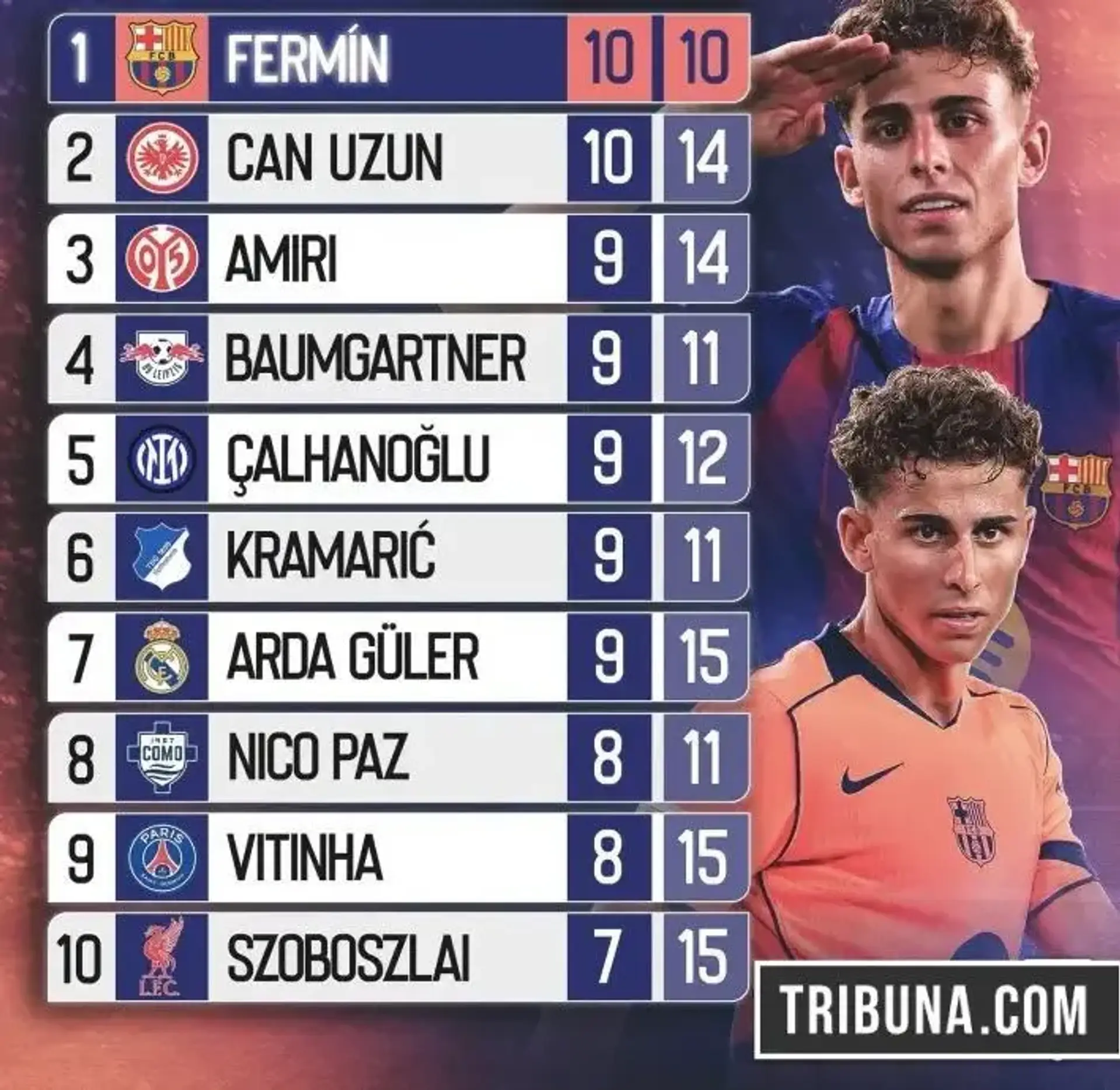 ΠΠ° Π²Π΅ΡΡΠΈΠ½Π΅ ΡΠΏΠΈΡΠΊΠ° β Π€Π΅ΡΠΌΠΈΠ½ ΠΠΎΠΏΠ΅Ρ ΠΈΠ· Β«ΠΠ°ΡΡΠ΅Π»ΠΎΠ½ΡΒ» Ρ 10 ΡΠ΅Π·ΡΠ»ΡΡΠ°ΡΠΈΠ²Π½ΡΠΌΠΈ Π΄Π΅ΠΉΡΡΠ²ΠΈΡΠΌΠΈ Π² 10 ΠΌΠ°ΡΡΠ°Ρ . ΠΠ° Π½ΠΈΠΌ ΠΈΠ΄ΡΡ ΠΠ°Π½ Π£Π·ΡΠ½ (Β«ΠΠΉΠ½ΡΡΠ°Ρ ΡΒ»), ΠΠ°Π΄ΠΈΠΌ ΠΠΌΠΈΡΠΈ (Β«ΠΠ°ΠΉΠ½ΡΒ»), ΠΠ°ΡΠΌΠ³Π°ΡΡΠ½Π΅Ρ (Β«ΠΠ΅ΠΉΠΏΡΠΈΠ³Β») ΠΈ ΠΡΠ°ΠΌΠ°ΡΠΈΡ (Β«Π₯ΠΎΡΡΠ΅Π½Ρ Π°ΠΉΠΌΒ») β Ρ Π²ΡΠ΅Ρ ΠΏΠΎ 9β10 ΠΎΡΠΊΠΎΠ² ΠΏΠΎ ΡΠΈΡΡΠ΅ΠΌΠ΅ Β«Π³ΠΎΠ»+ΠΏΠ°ΡΒ».