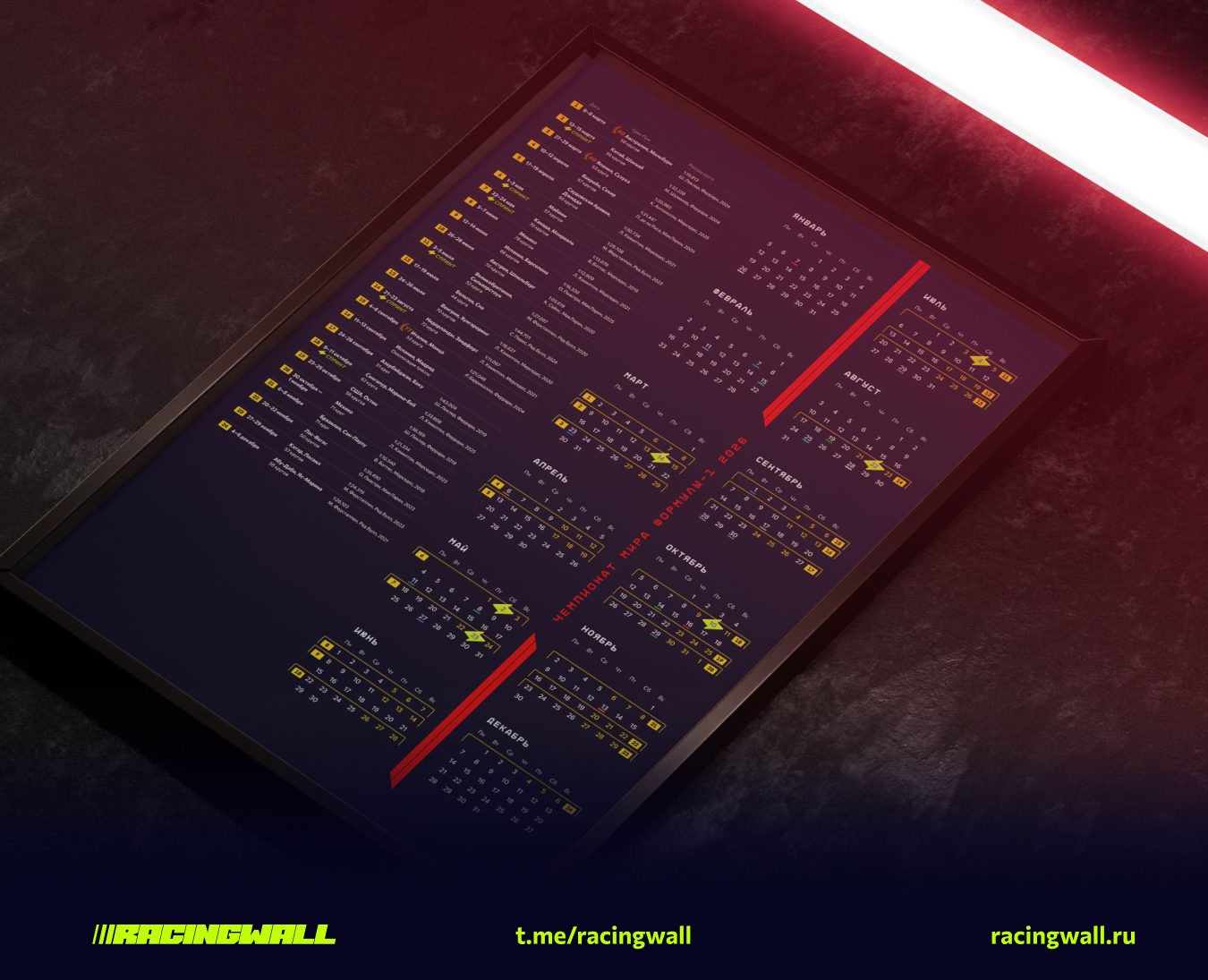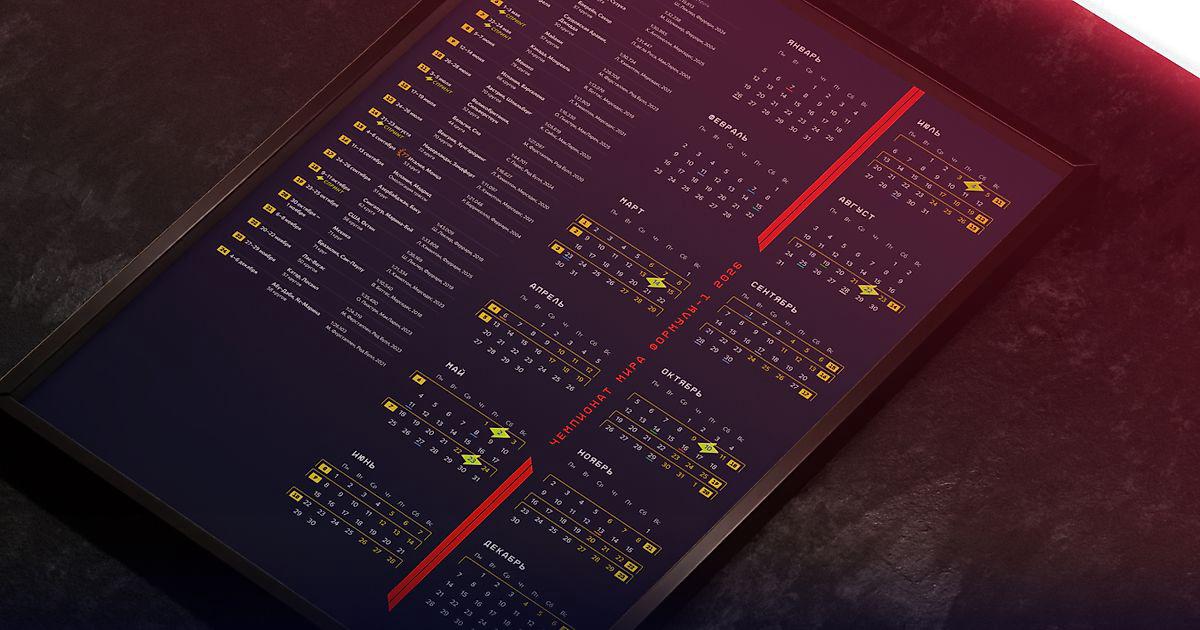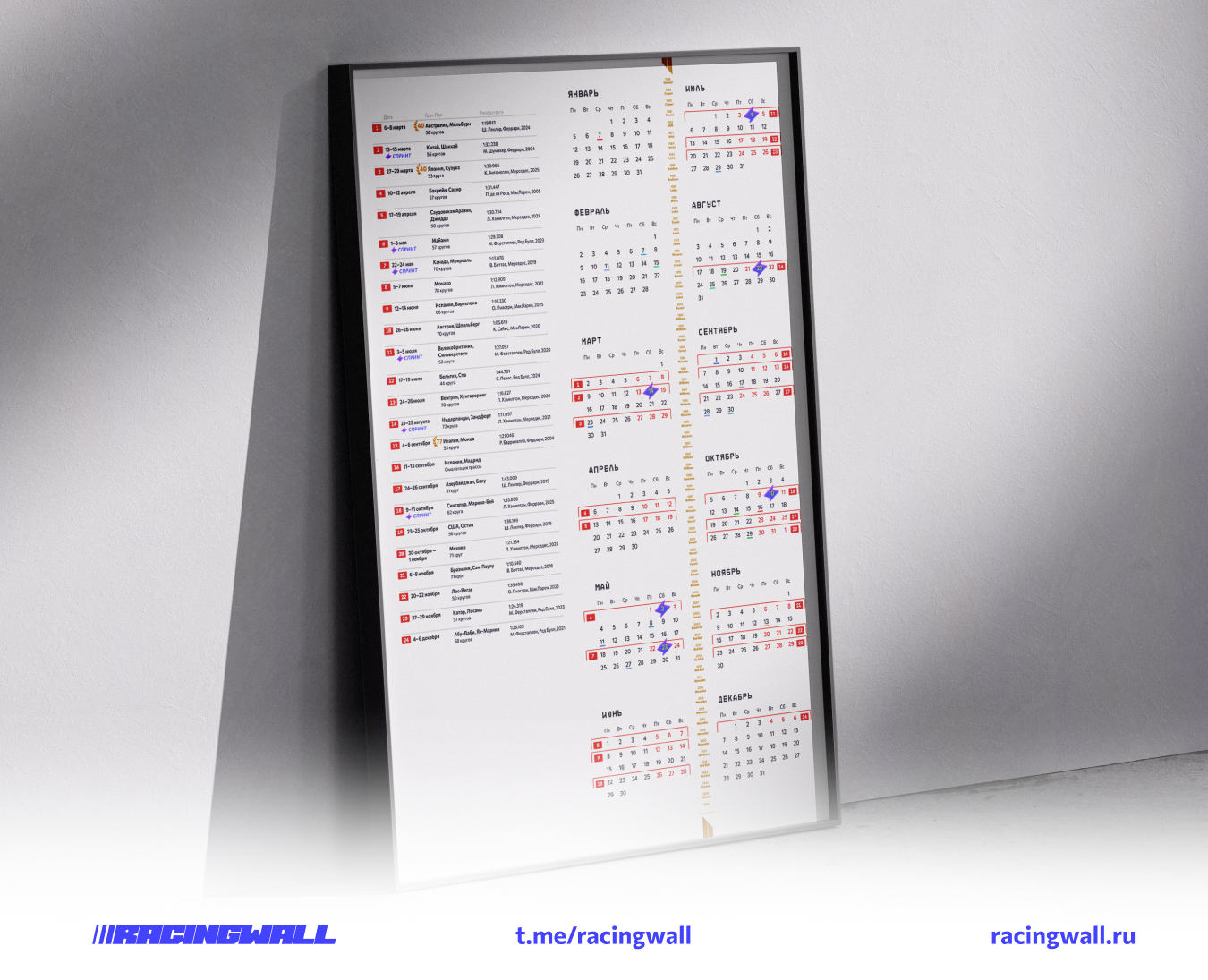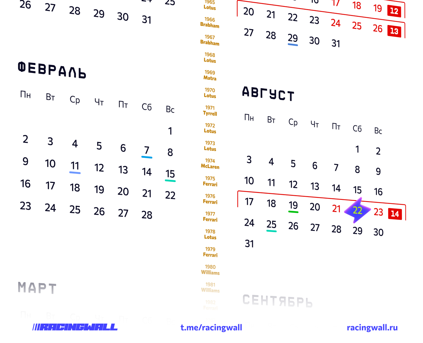 Основное отличие в разделителях между полугодиями календарной сетки. И тут у меня снова борьба вариантов — контрастный с названием календаря и историко-информативный с перечислением всех чемпионов кубков конструкторов начиная с 1958 года, именно тогда стали подсчитывать очки не только личного зачета пилотов, но и конструкторов. А в 2026 году оставлено место для вписывания чемпиона собственноручно, на темном календаре это можно будет сделать белым перманентным маркером, на светлой любым контрастным пишущим инструментом.