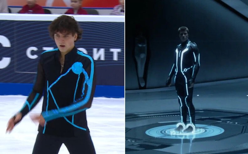 4. Еще один технарь вышел на лед впервые в сезоне. Речь о Макаре Игнатове, он выступал с короткой под саундтрек к фильму «Трон». Костюм казался многообещающим – на него добавили светодиоды, а большая выпуклая кнопка на ключице должна была отвечать за эффект «вау».