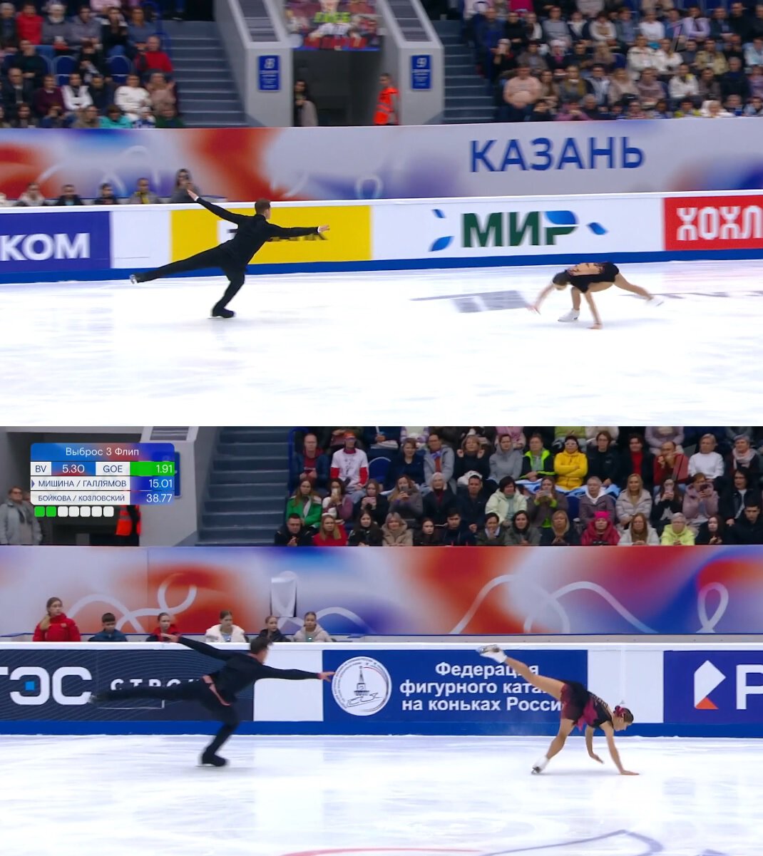 Мишиной меньше сбавили за касание льда на сальхове. Бойкова и Козловский получили чуть больше за подкрутку, а Мишина и Галлямов – за выброс. Тодес Бойковой и Козловского понравился судьям сильнее, зато дорожка у них второго уровня, а у Мишиной и Галлямова – третьего.