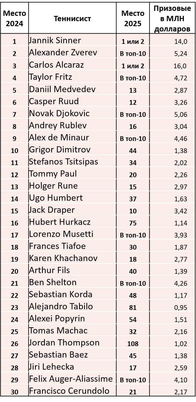 Например: Андрей Рублев. Закончил 2024 год восьмым, а сейчас только 16й. Но во-первых, у него есть титул Дохи, а во-вторых, неплохой гонорар за год, и это даёт ему возможность заниматься сторонними проектами и отдыхать от тенниса. Он шеф в одной детской больнице и переводит ей средства. У Коболли, например, сумма призовых за этот год меньше, а ему, кажется, хватило на недвижимость в Монте-Карло, поскольку он который раз постит оттуда фотки. И в лифте чисто :)