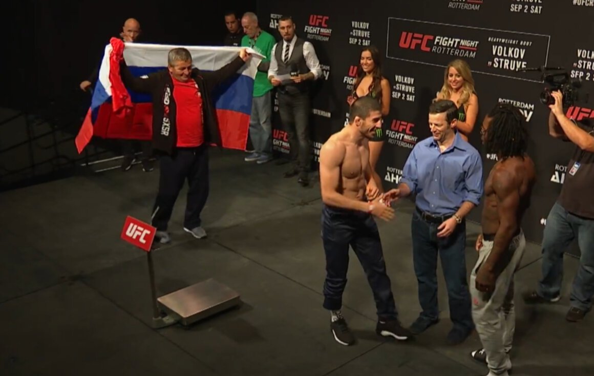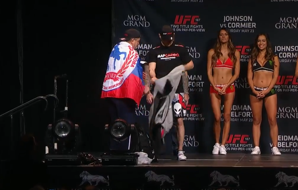 Позднее боец Алексей Олейник рассказывал, что проблема могла быть лишь в одном – у UFC есть четкое требование к флагам: полотно должно полностью соответствовать и быть точной копией официального флага государства, без нанесения дополнительных изображений, символов и рекламы.